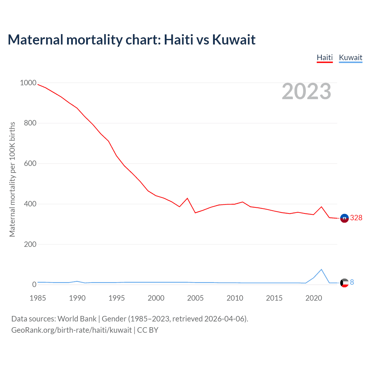 The maternal mortality rate, which is the probability of dying during childbirth or within 42 days of pregnancy termination, is 328 deaths per 100,000 live births in Haiti, compared to 8 deaths in Kuwait.