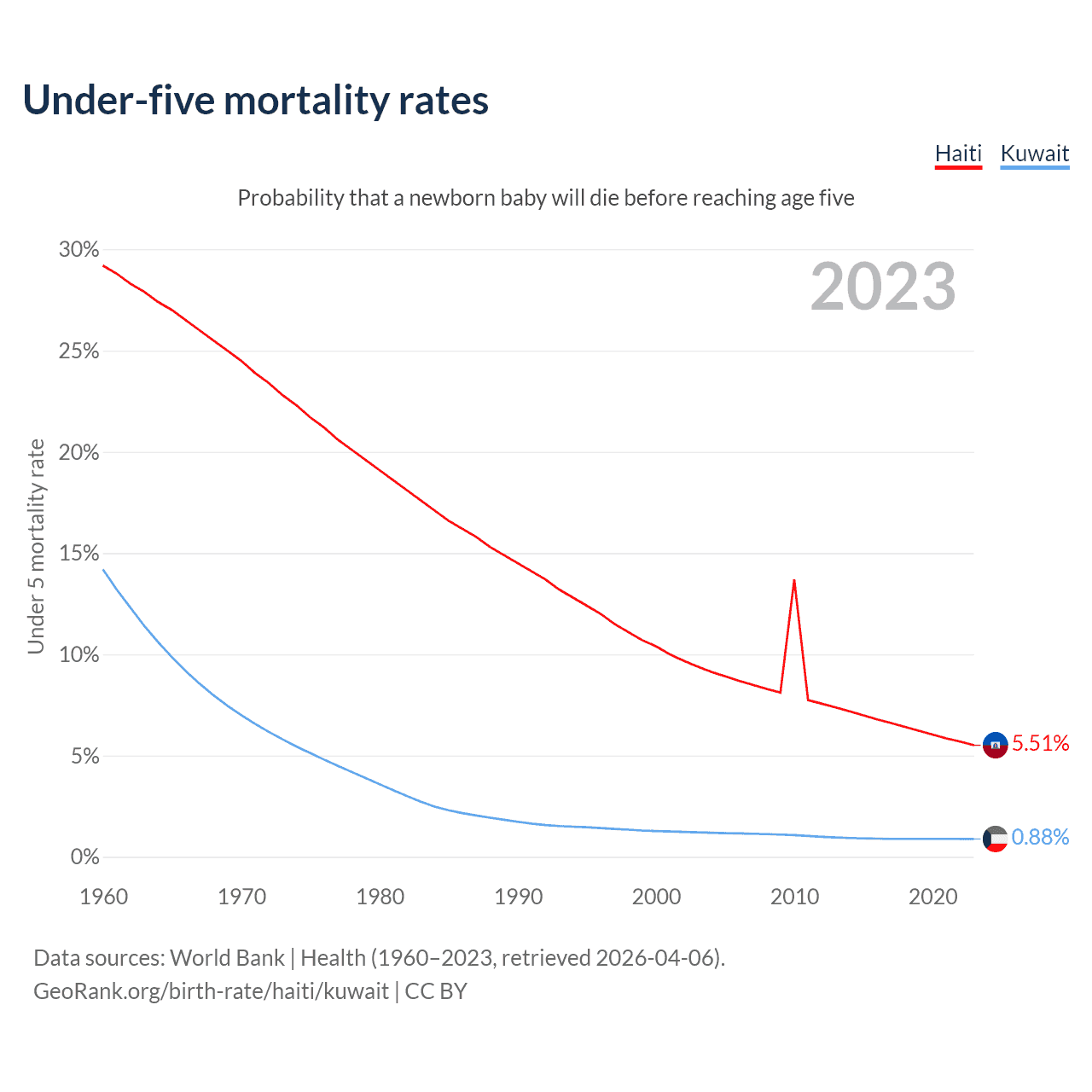 The chance that a newborn baby will die before reaching age five is 5.51% in Haiti and 0.88% in Kuwait. Above is a chart with historical data on under-five mortality rates.