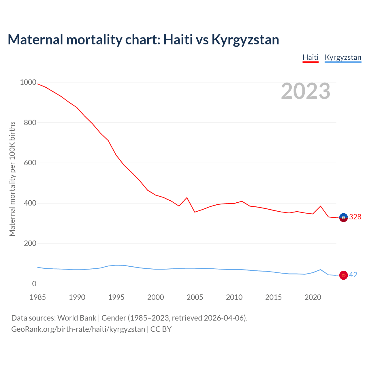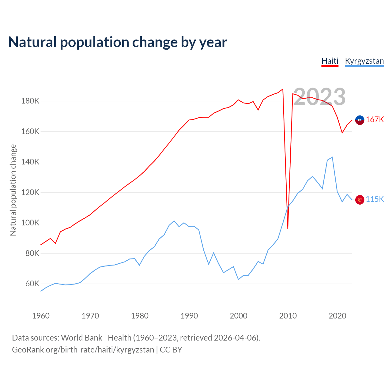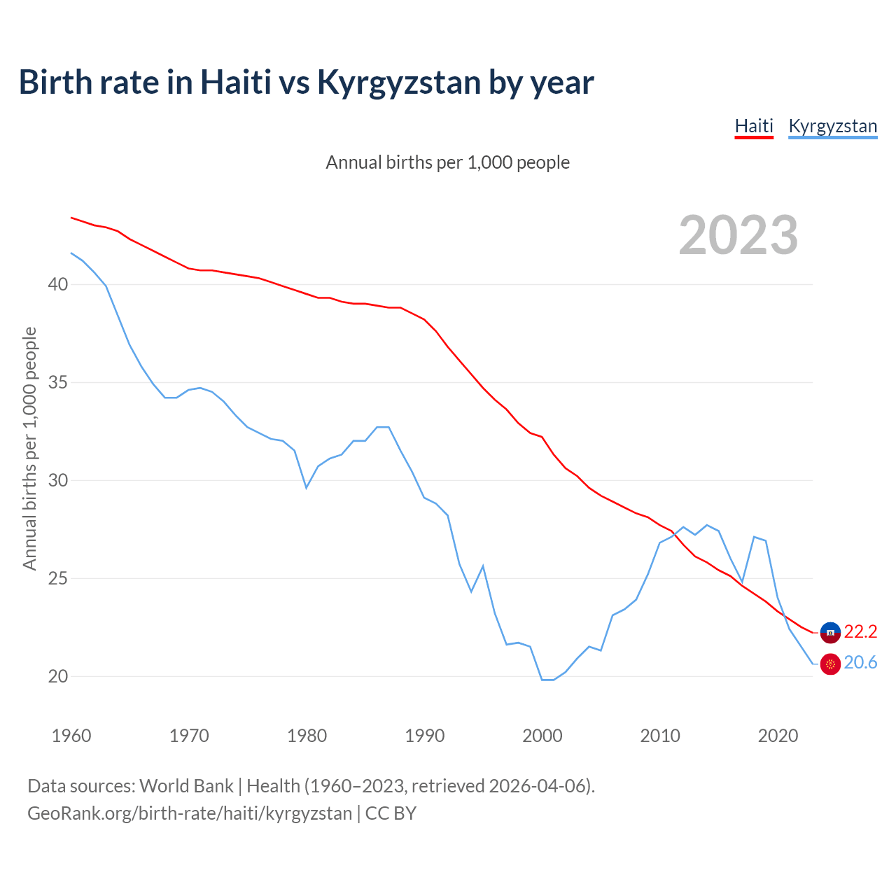 Haiti has an annual birth rate of 22.2 births per 1,000 people, compared to 20.6 for Kyrgyzstan. The average number of children a woman is expected to have during her lifetime — the fertility rate, is 2.66 in Haiti and 2.7 in Kyrgyzstan — 1.66% difference.