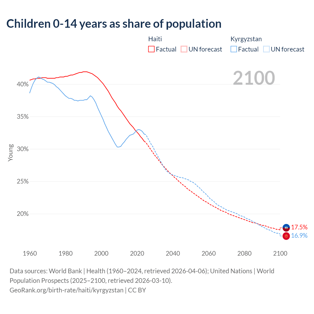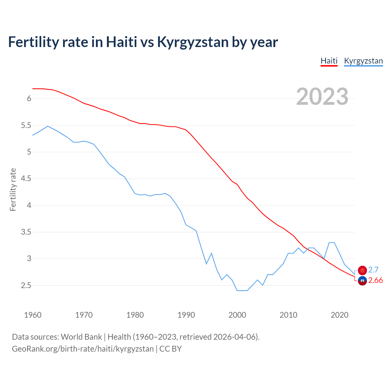 According to the latest available data on birth rates, the fertility rate in Haiti was 2.66 children per woman in 2023, compared to 2.7 in Kyrgyzstan in 2023. The replacement level is considered to be 2.1 children per woman.