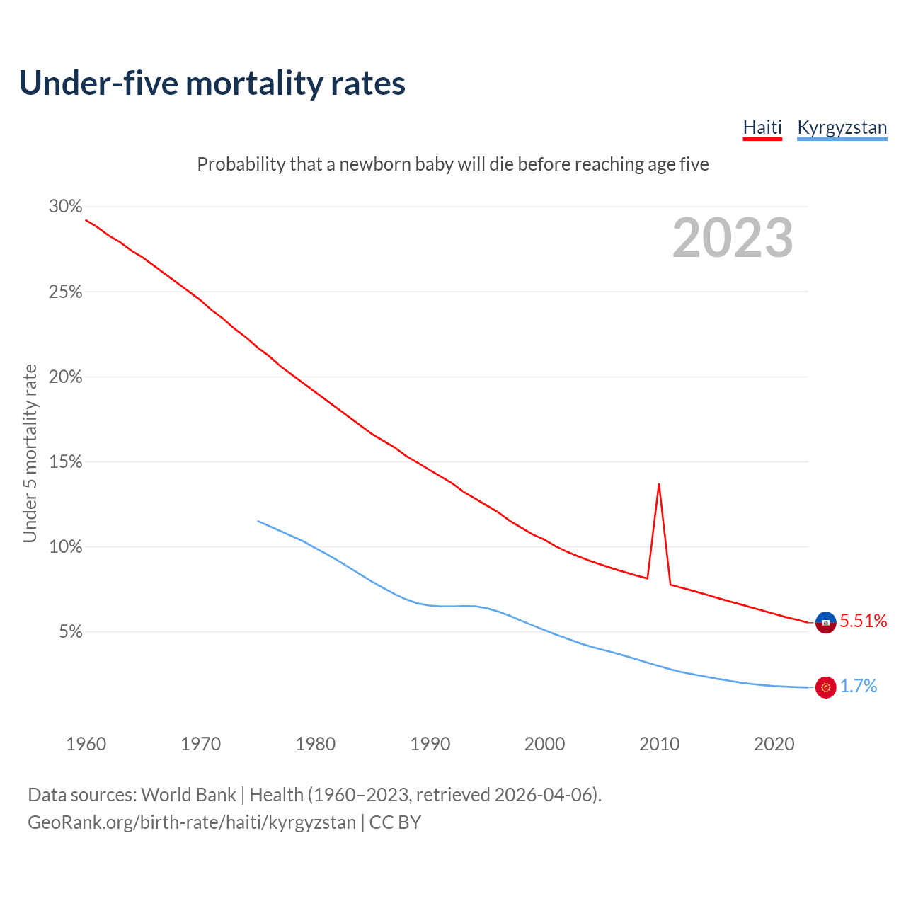 The chance that a newborn baby will die before reaching age five is 5.51% in Haiti and 1.7% in Kyrgyzstan. Above is a chart with historical data on under-five mortality rates.