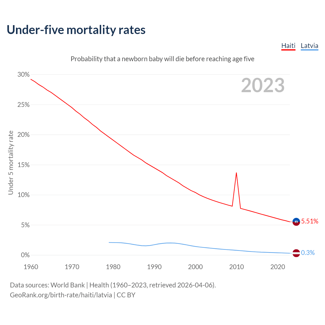 The chance that a newborn baby will die before reaching age five is 5.51% in Haiti and 0.3% in Latvia. Above is a chart with historical data on under-five mortality rates.