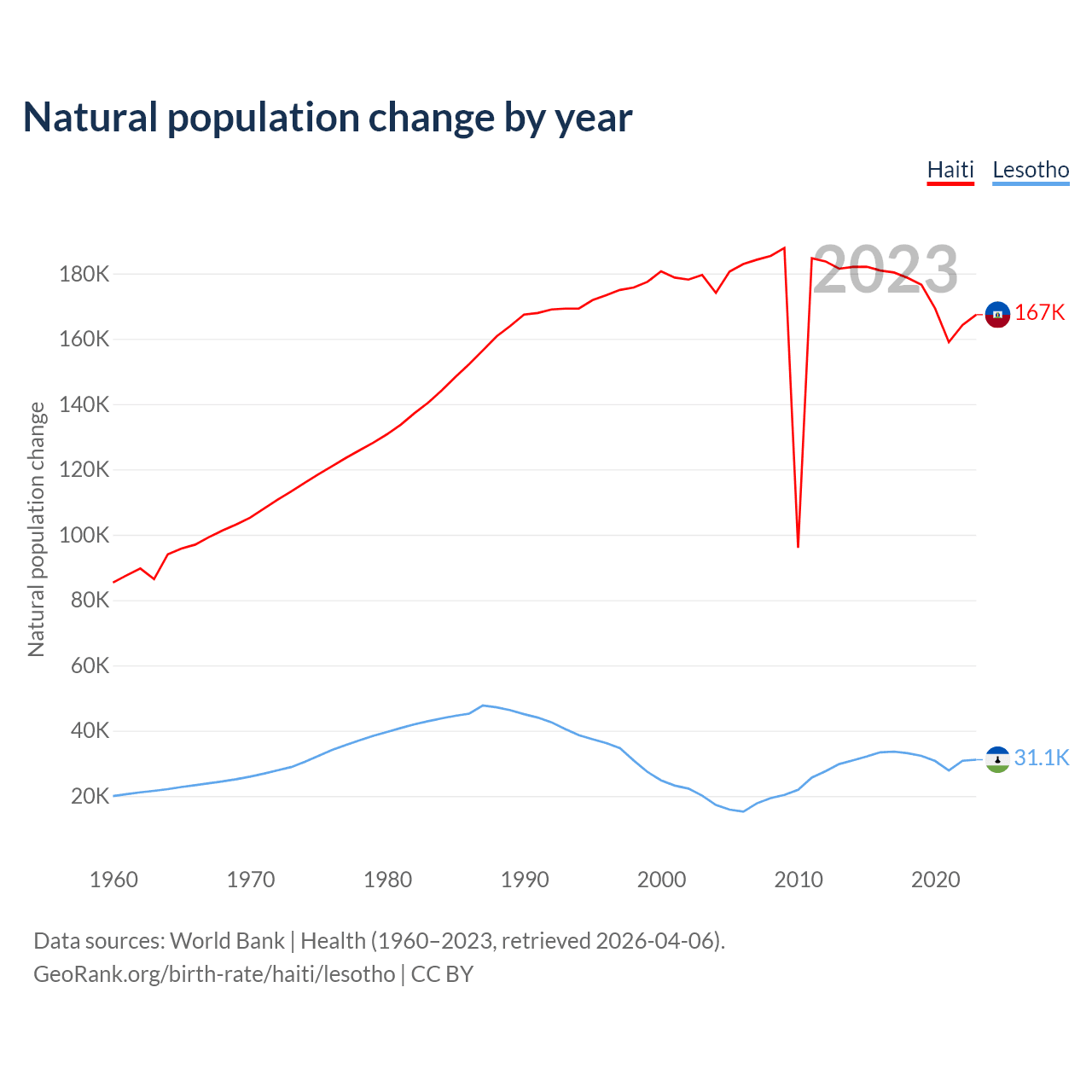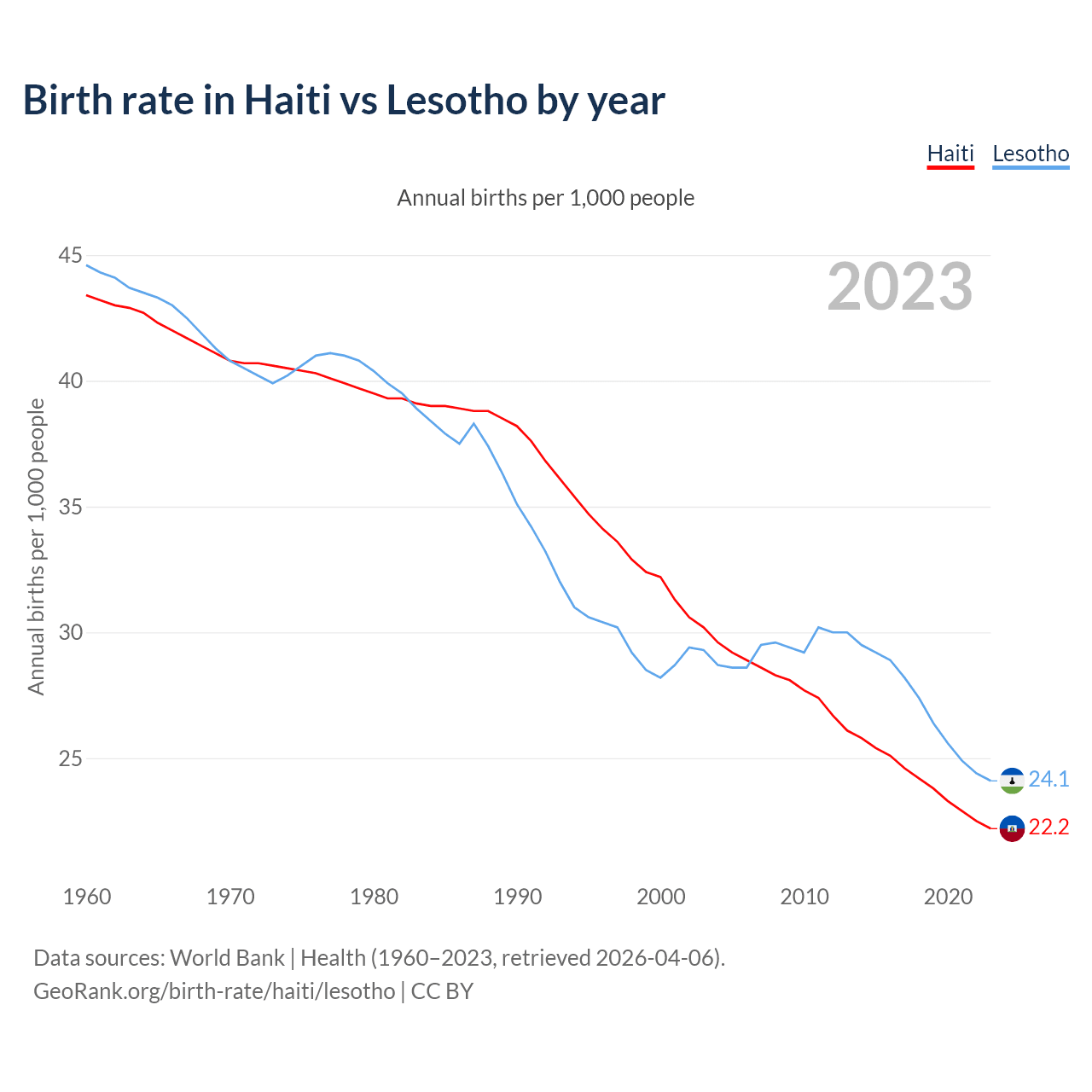 Haiti has an annual birth rate of 22.2 births per 1,000 people, compared to 24.1 for Lesotho. The average number of children a woman is expected to have during her lifetime — the fertility rate, is 2.66 in Haiti and 2.69 in Lesotho — 1.43% difference.