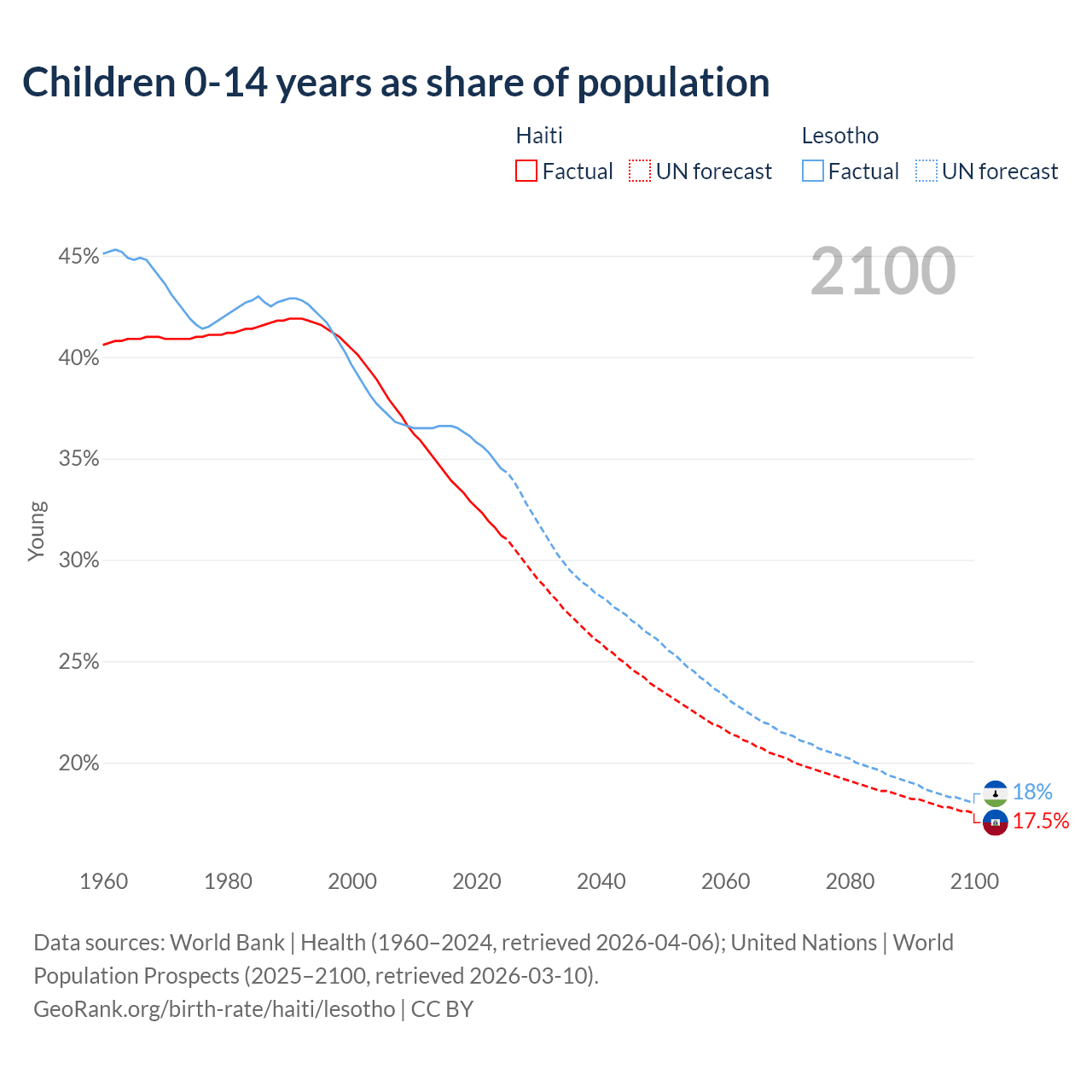 According to the latest available data on birth rates, the fertility rate in Haiti was 2.66 children per woman in 2023, compared to 2.69 in Lesotho in 2023. The replacement level is considered to be 2.1 children per woman.