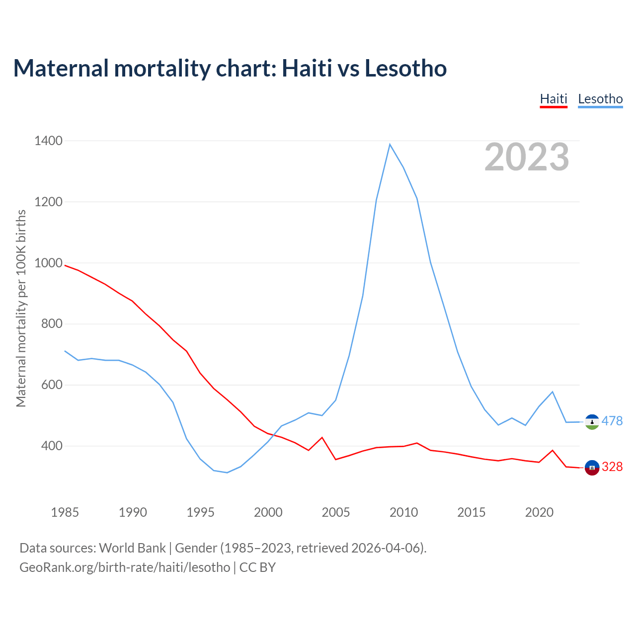The maternal mortality rate, which is the probability of dying during childbirth or within 42 days of pregnancy termination, is 328 deaths per 100,000 live births in Haiti, compared to 478 deaths in Lesotho.