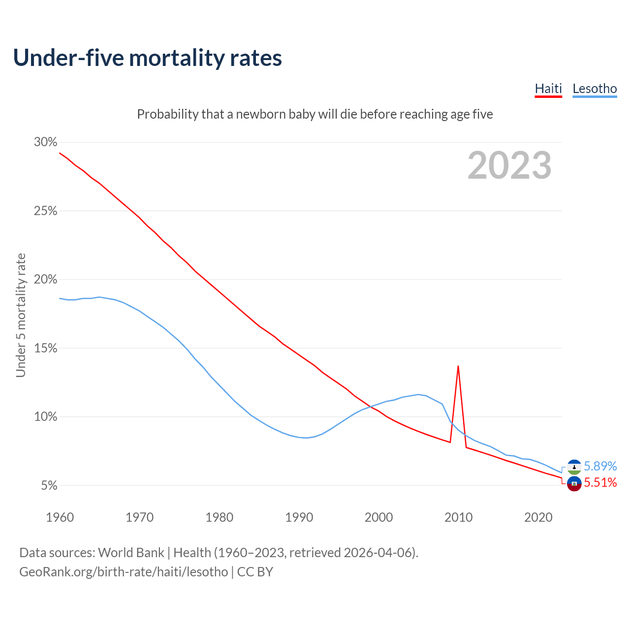 The chance that a newborn baby will die before reaching age five is 5.51% in Haiti and 5.89% in Lesotho. Above is a chart with historical data on under-five mortality rates.
