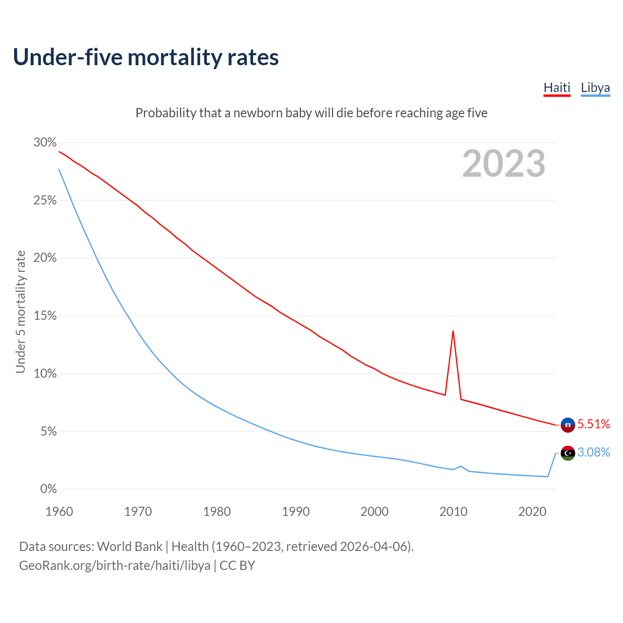 The chance that a newborn baby will die before reaching age five is 5.51% in Haiti and 3.08% in Libya. Above is a chart with historical data on under-five mortality rates.