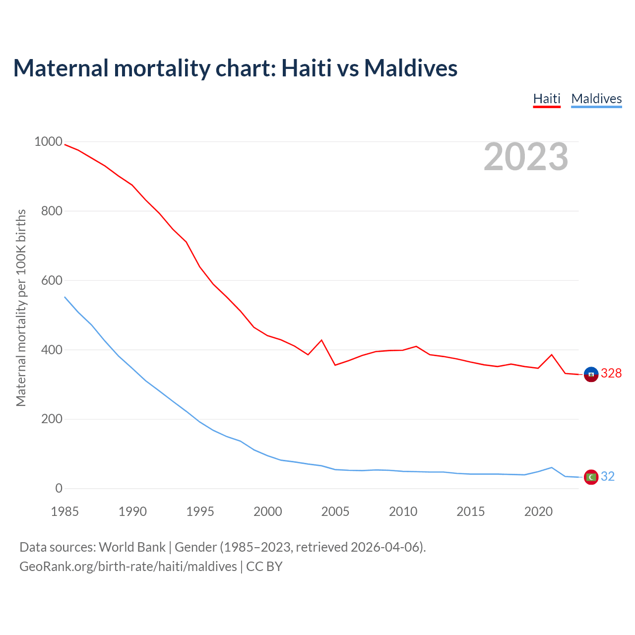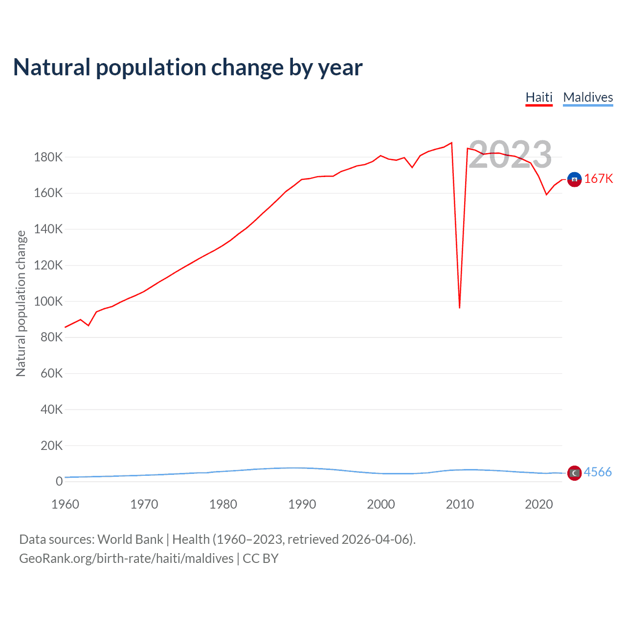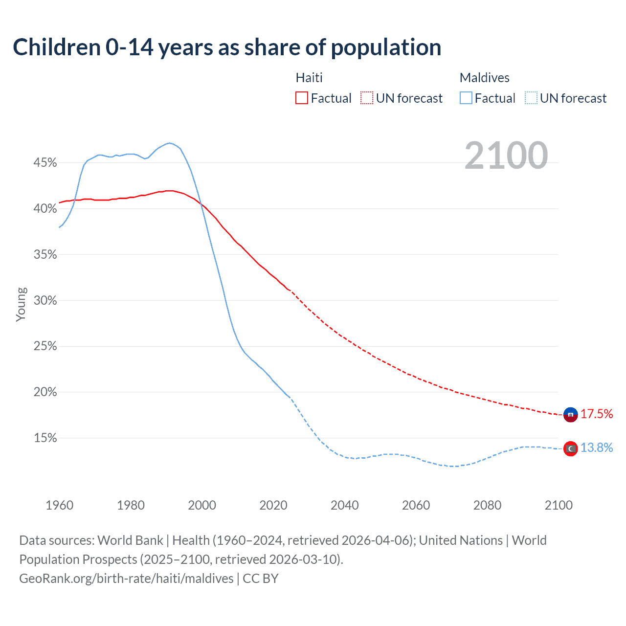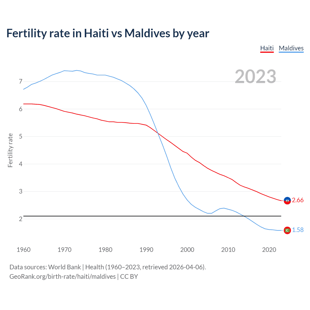 According to the latest available data on birth rates, the fertility rate in Haiti was 2.66 children per woman in 2023, compared to 1.58 in Maldives in 2023. The replacement level is considered to be 2.1 children per woman.
