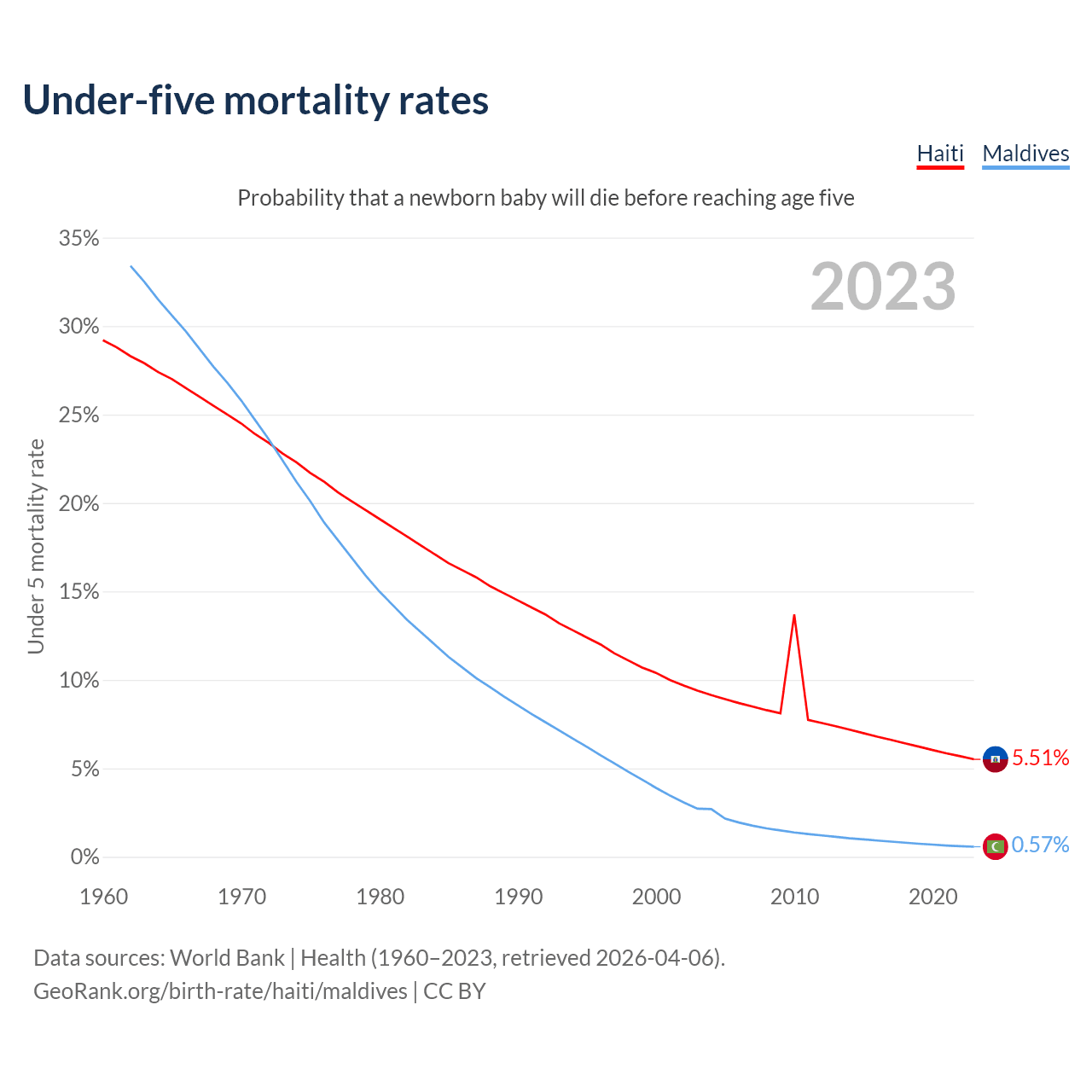 The chance that a newborn baby will die before reaching age five is 5.51% in Haiti and 0.57% in Maldives. Above is a chart with historical data on under-five mortality rates.