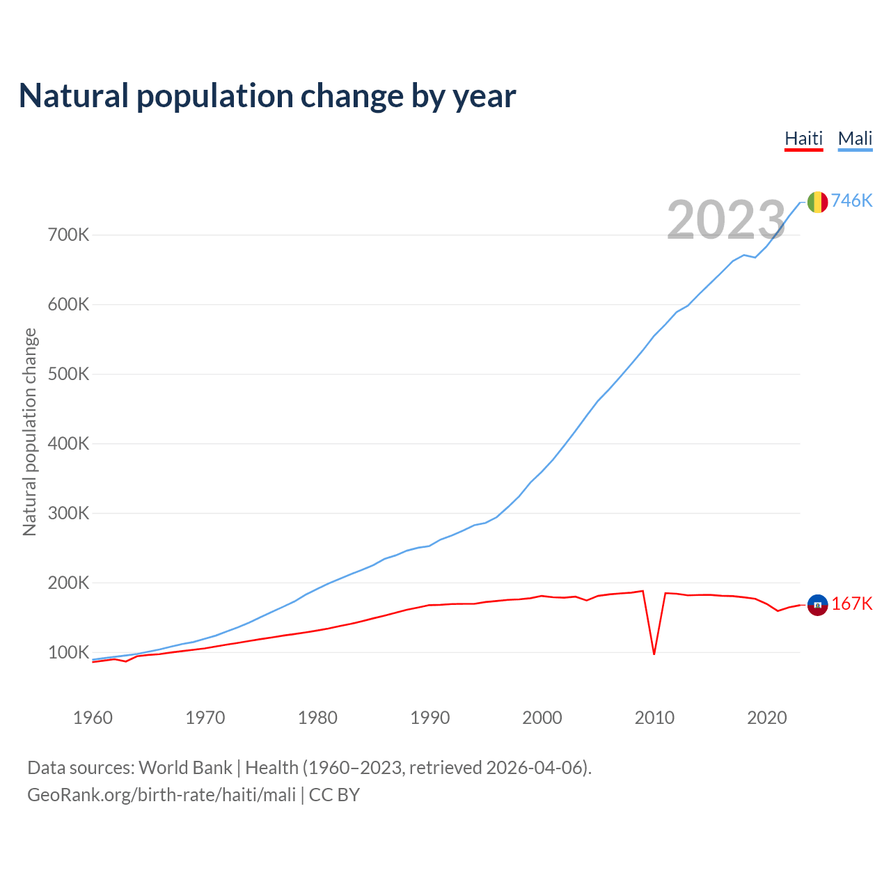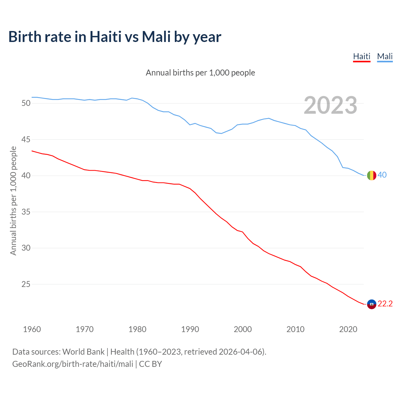Haiti has an annual birth rate of 22.2 births per 1,000 people, compared to 40 for Mali. The average number of children a woman is expected to have during her lifetime — the fertility rate, is 2.66 in Haiti and 5.61 in Mali — 111.4% difference.