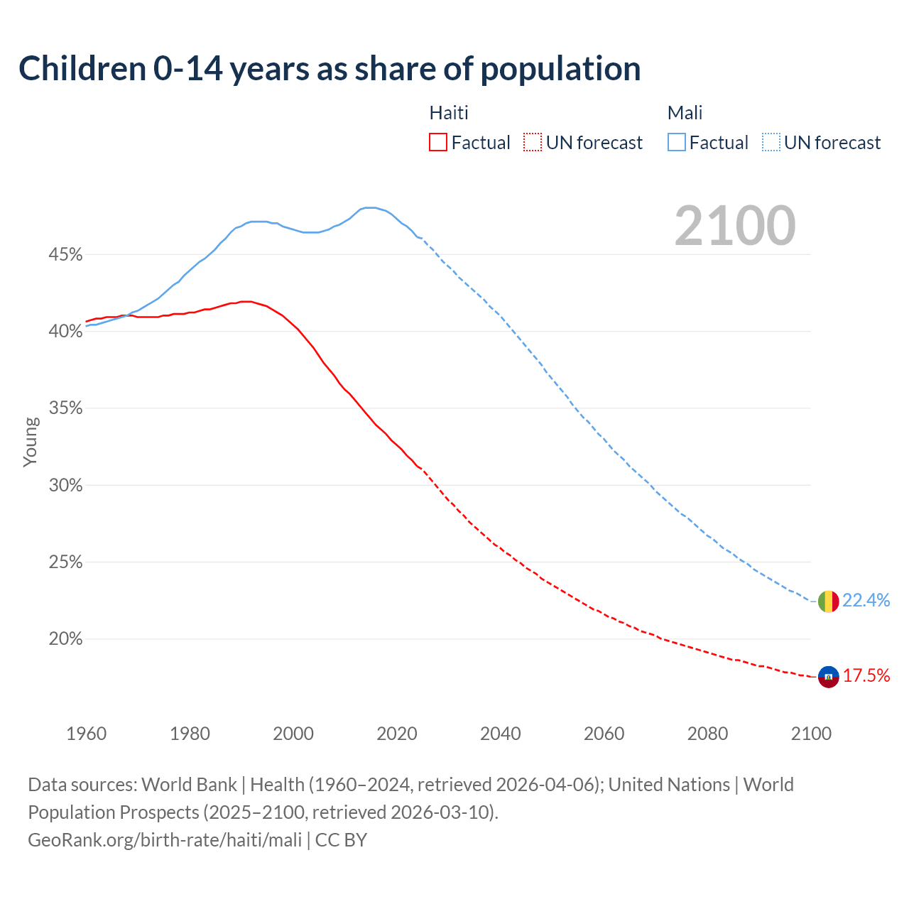 According to the latest available data on birth rates, the fertility rate in Haiti was 2.66 children per woman in 2023, compared to 5.61 in Mali in 2023. The replacement level is considered to be 2.1 children per woman.