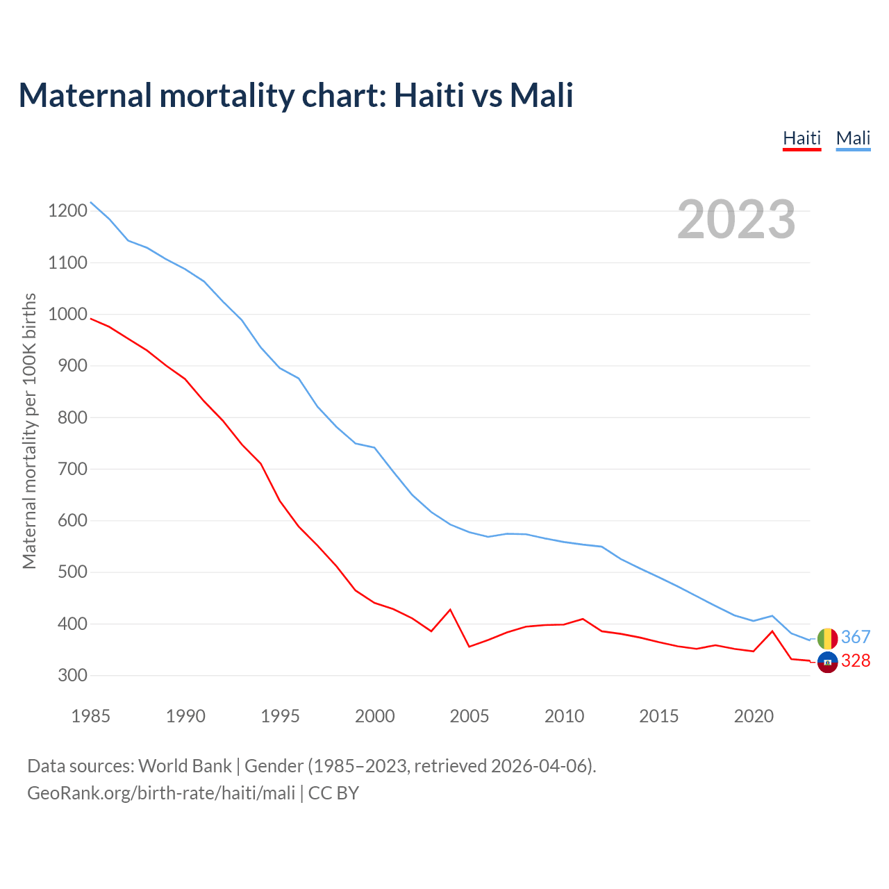 The maternal mortality rate, which is the probability of dying during childbirth or within 42 days of pregnancy termination, is 328 deaths per 100,000 live births in Haiti, compared to 367 deaths in Mali.