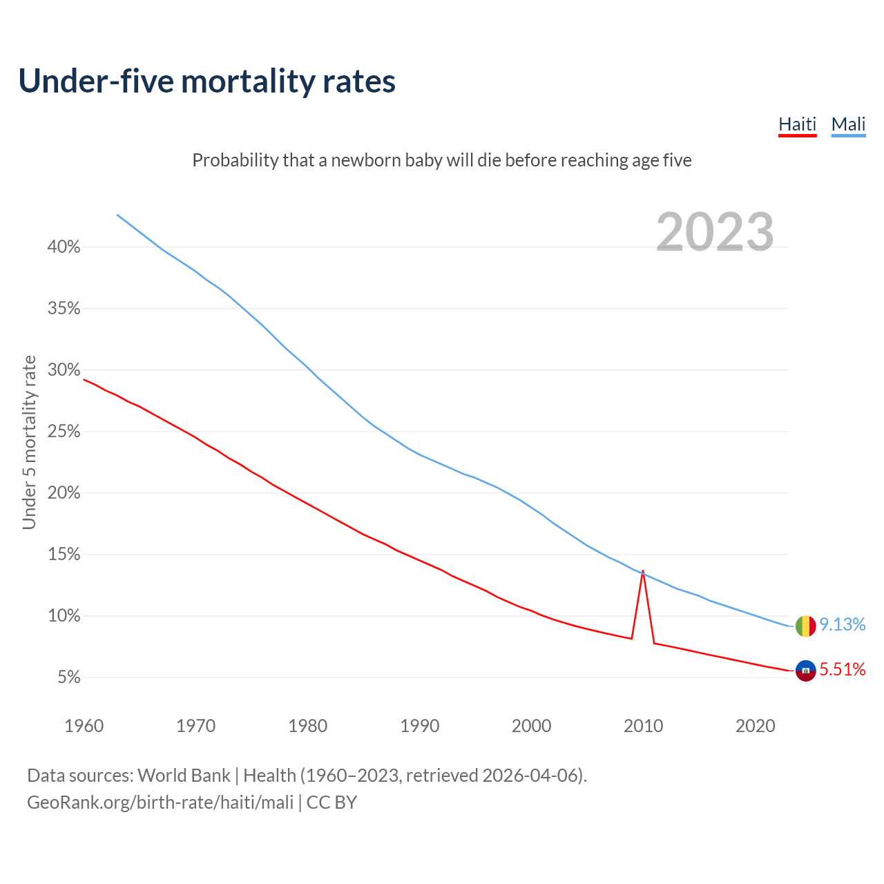 The chance that a newborn baby will die before reaching age five is 5.51% in Haiti and 9.13% in Mali. Above is a chart with historical data on under-five mortality rates.