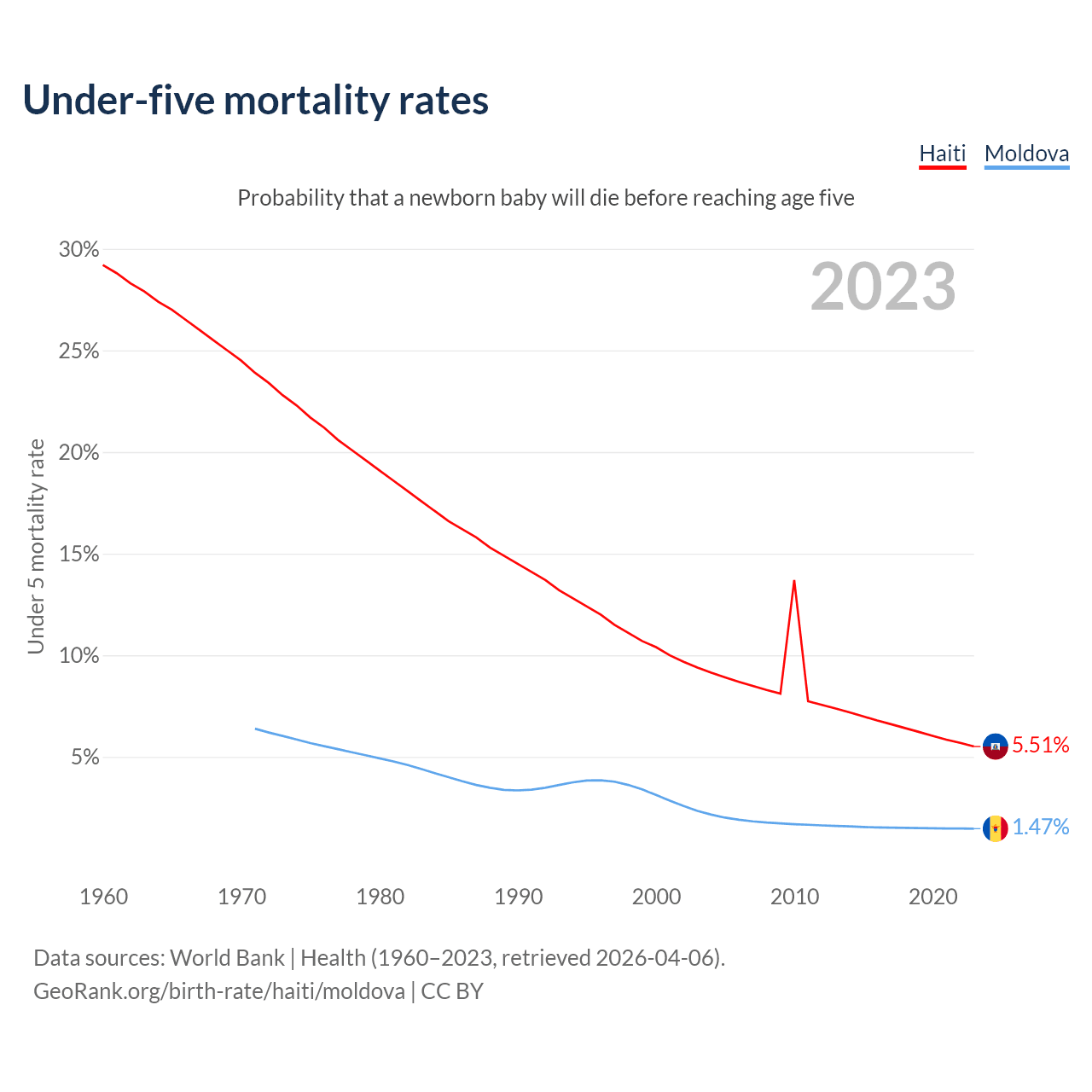 The chance that a newborn baby will die before reaching age five is 5.51% in Haiti and 1.47% in Moldova. Above is a chart with historical data on under-five mortality rates.
