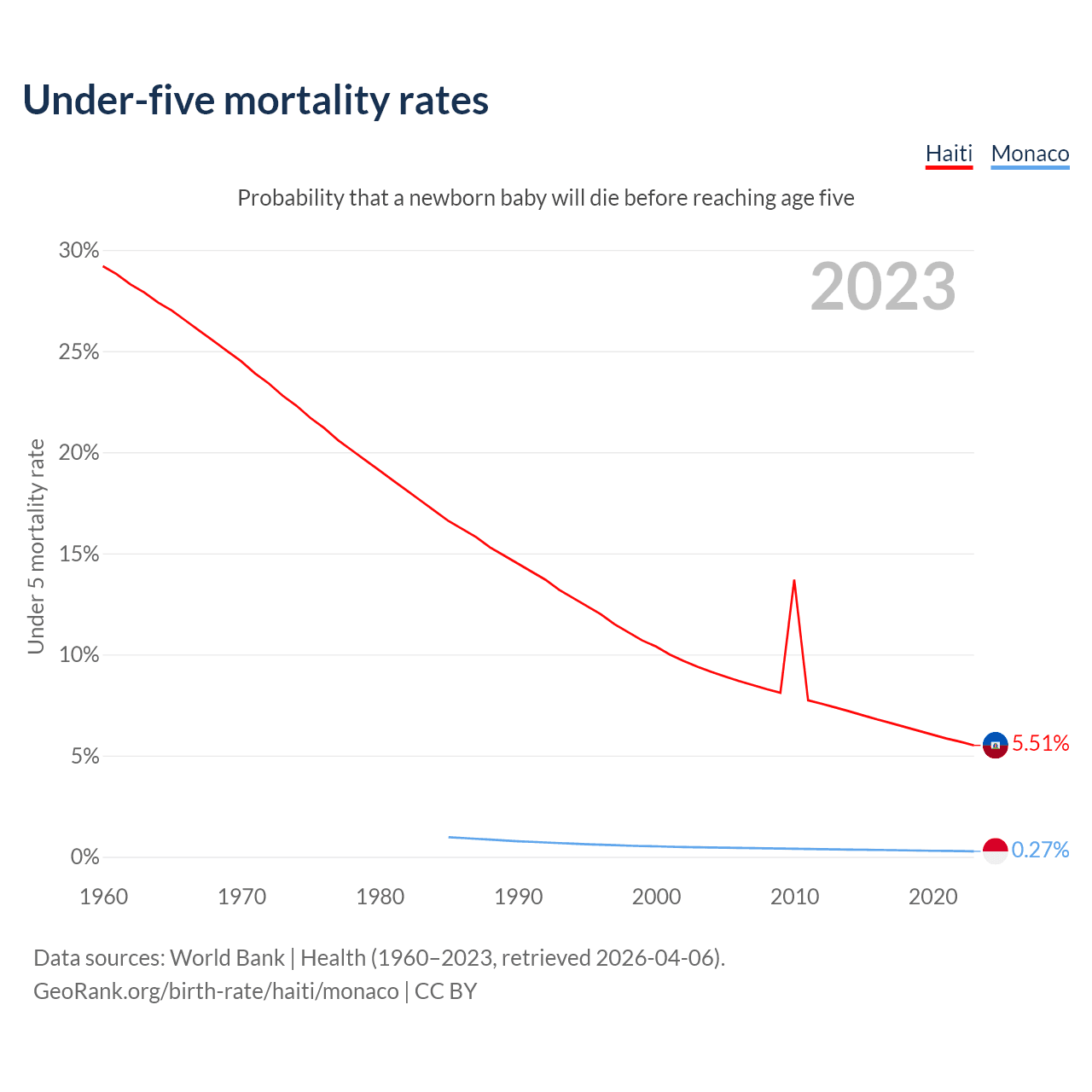 The chance that a newborn baby will die before reaching age five is 5.51% in Haiti and 0.27% in Monaco. Above is a chart with historical data on under-five mortality rates.