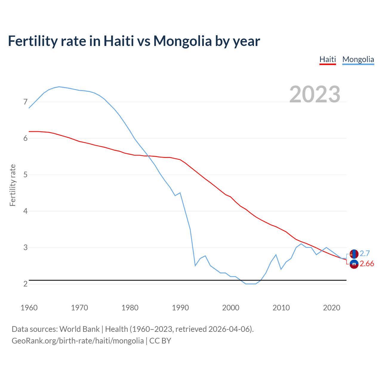 According to the latest available data on birth rates, the fertility rate in Haiti was 2.66 children per woman in 2023, compared to 2.7 in Mongolia in 2023. The replacement level is considered to be 2.1 children per woman.