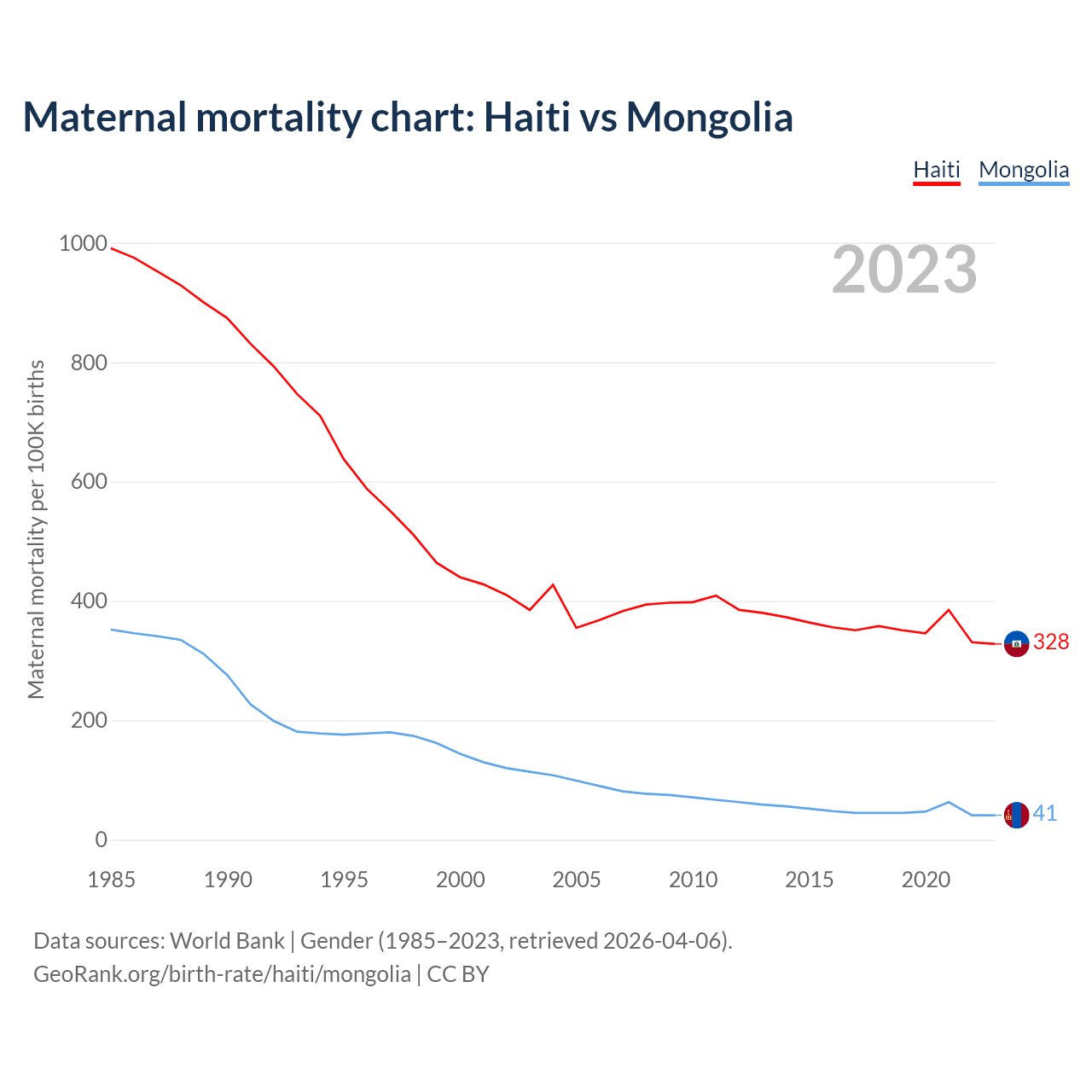 The maternal mortality rate, which is the probability of dying during childbirth or within 42 days of pregnancy termination, is 328 deaths per 100,000 live births in Haiti, compared to 41 deaths in Mongolia.
