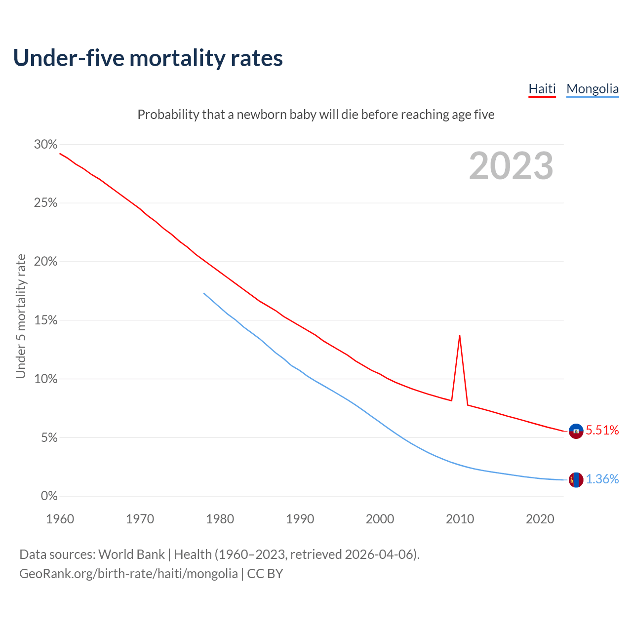 The chance that a newborn baby will die before reaching age five is 5.51% in Haiti and 1.36% in Mongolia. Above is a chart with historical data on under-five mortality rates.