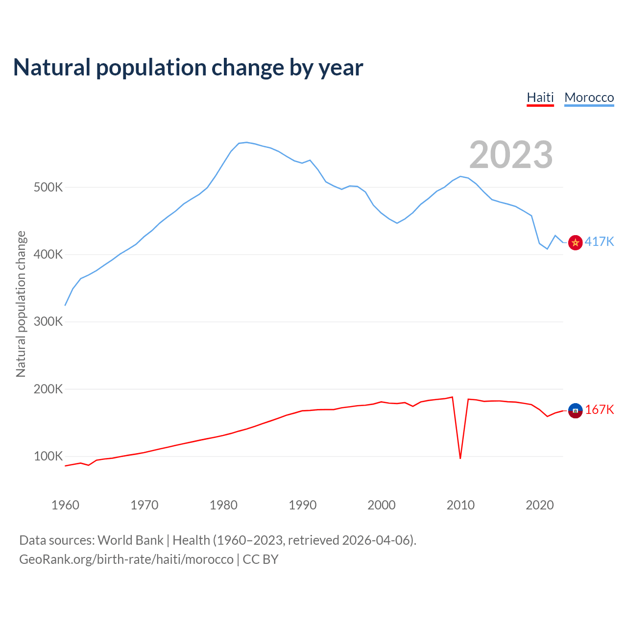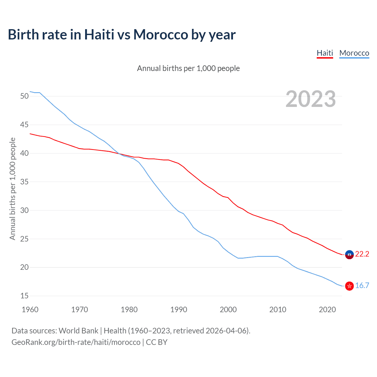 Haiti has an annual birth rate of 22.2 births per 1,000 people, compared to 16.7 for Morocco. The average number of children a woman is expected to have during her lifetime — the fertility rate, is 2.66 in Haiti and 2.23 in Morocco — 16% difference.