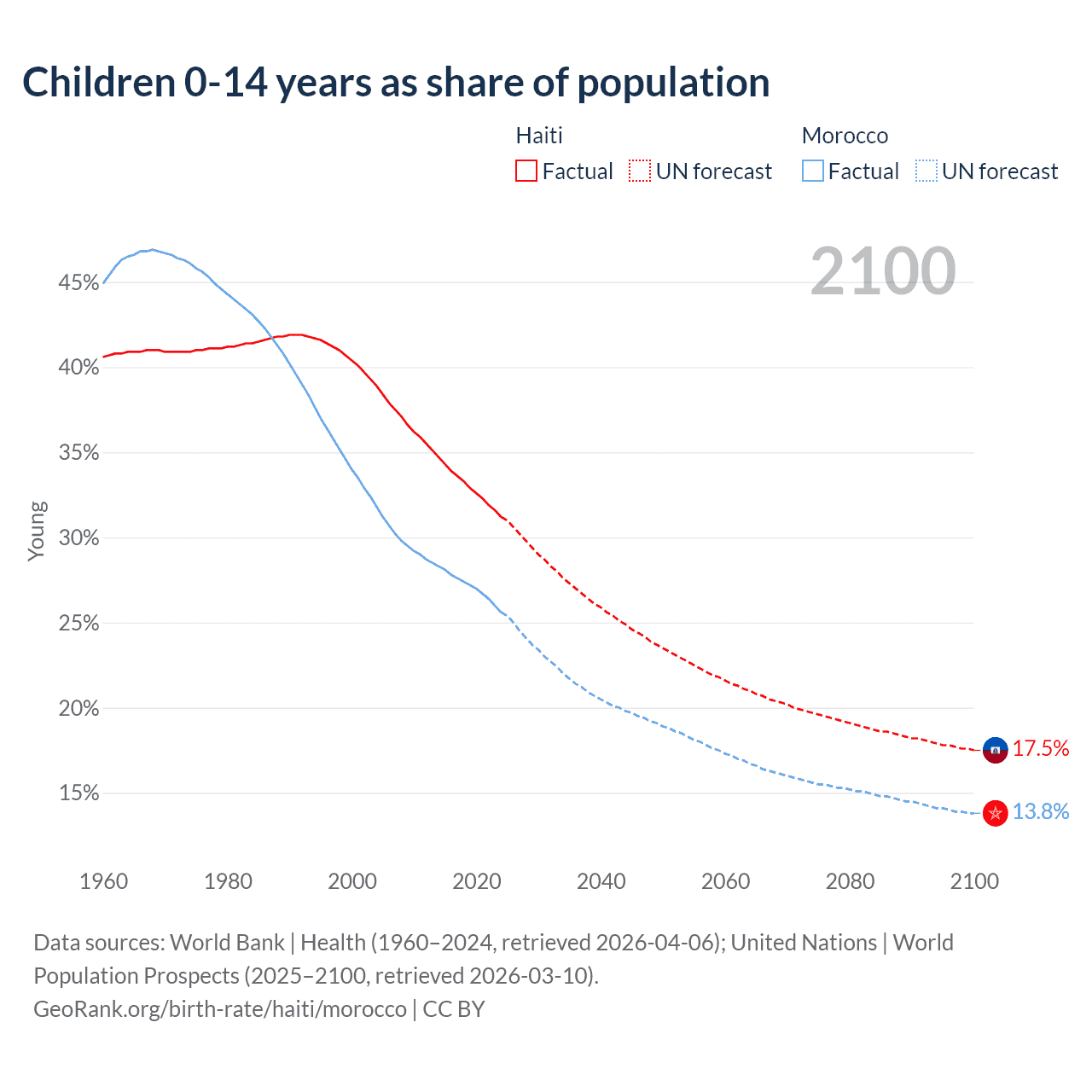 According to the latest available data on birth rates, the fertility rate in Haiti was 2.66 children per woman in 2023, compared to 2.23 in Morocco in 2023. The replacement level is considered to be 2.1 children per woman.