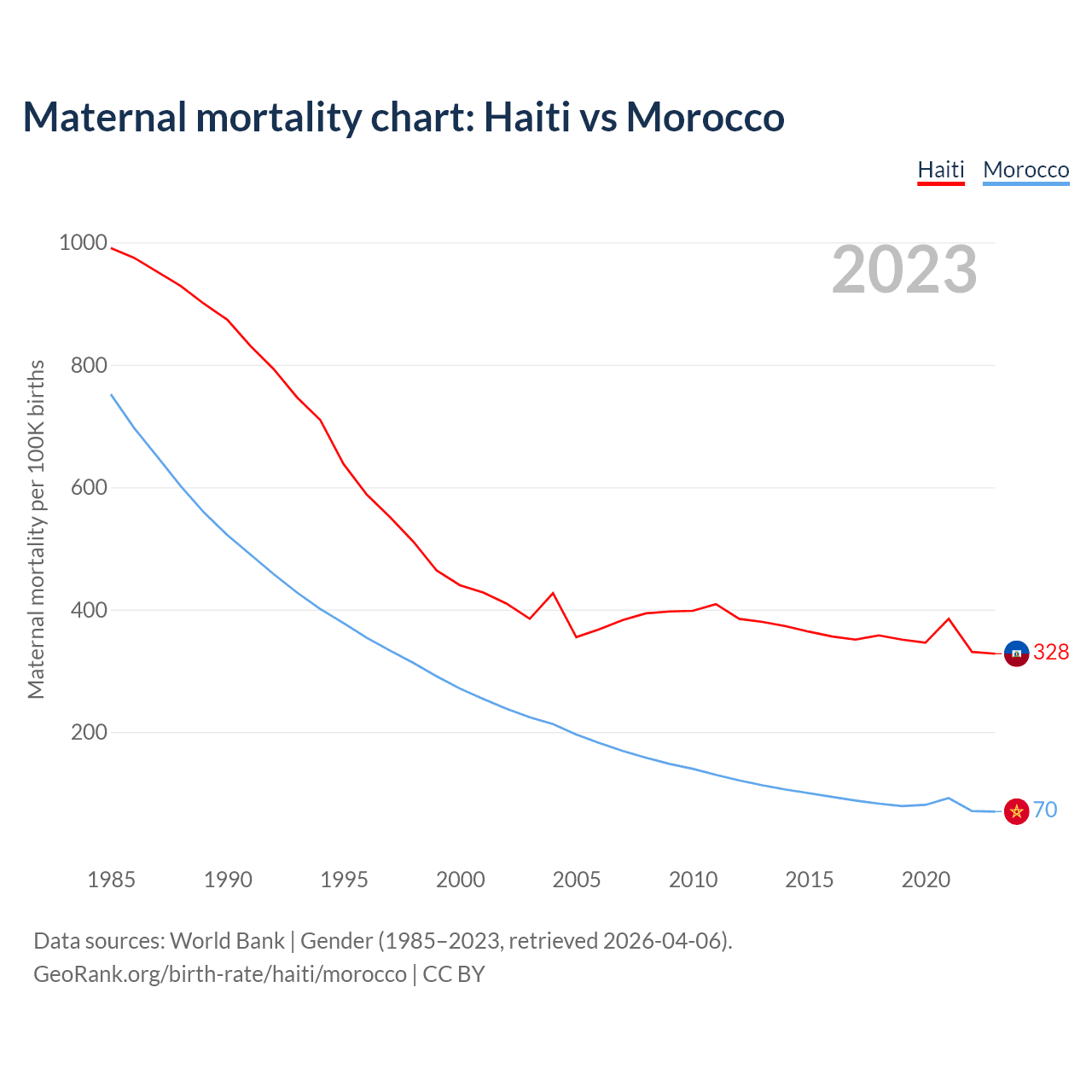The maternal mortality rate, which is the probability of dying during childbirth or within 42 days of pregnancy termination, is 328 deaths per 100,000 live births in Haiti, compared to 70 deaths in Morocco.