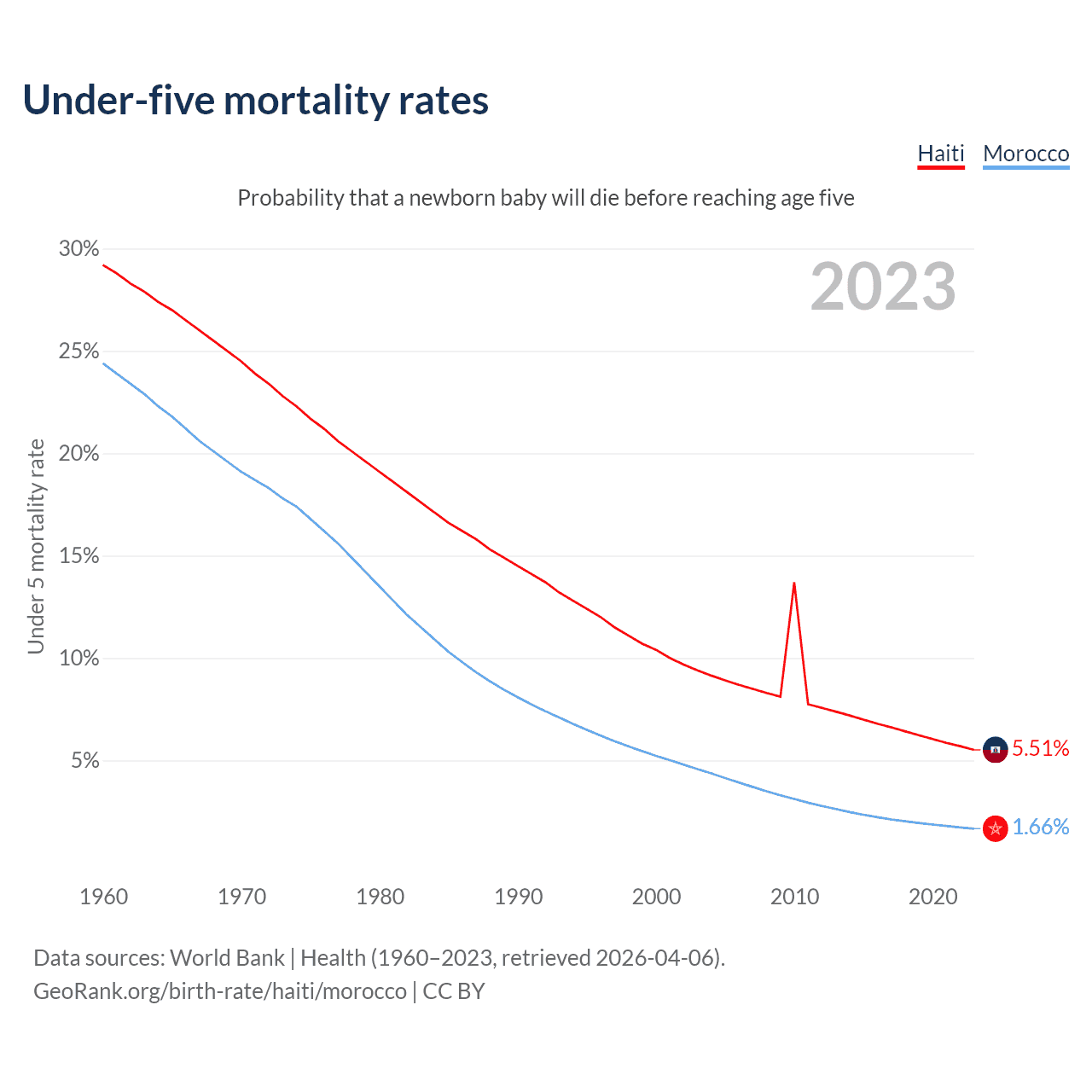 The chance that a newborn baby will die before reaching age five is 5.51% in Haiti and 1.66% in Morocco. Above is a chart with historical data on under-five mortality rates.