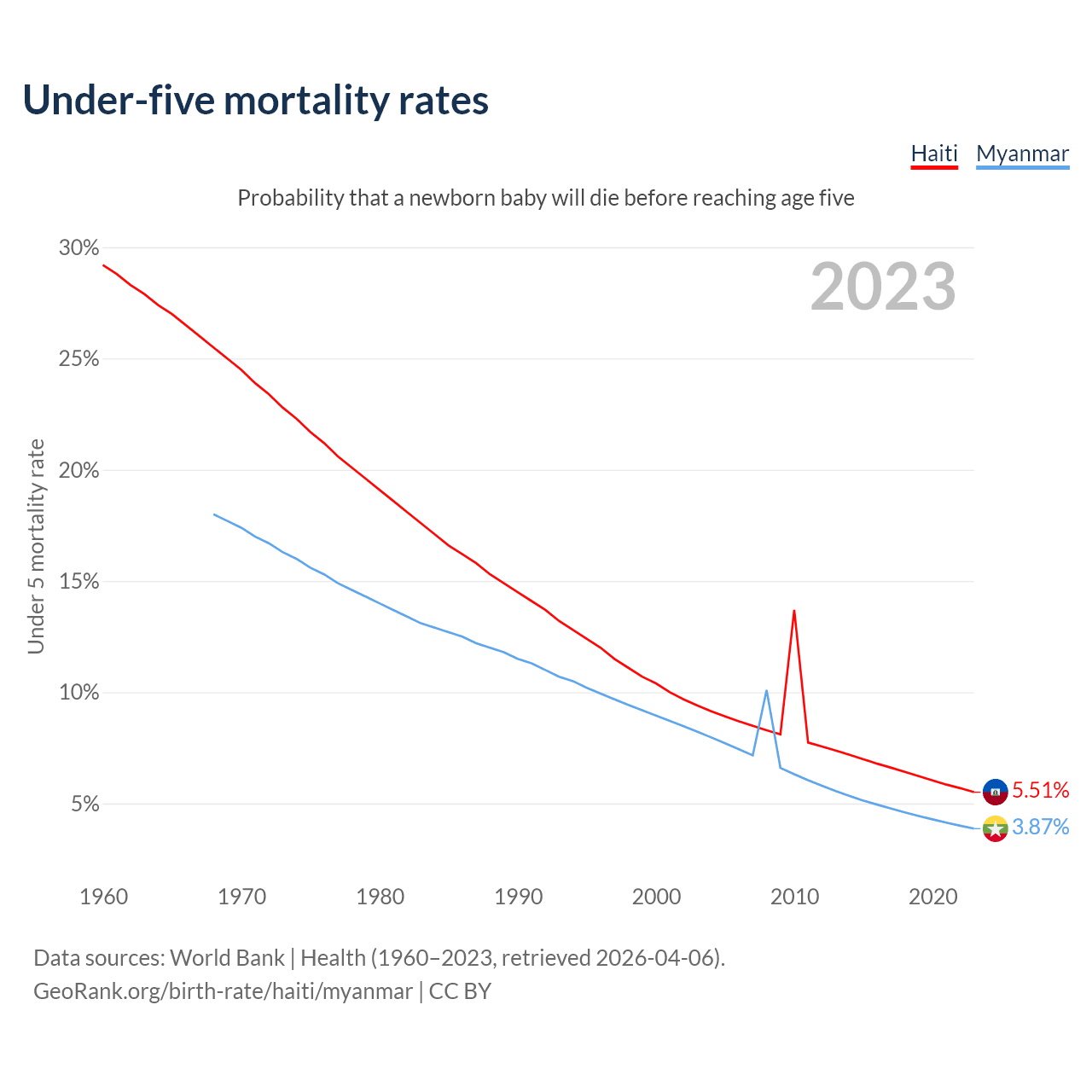 The chance that a newborn baby will die before reaching age five is 5.51% in Haiti and 3.87% in Myanmar. Above is a chart with historical data on under-five mortality rates.