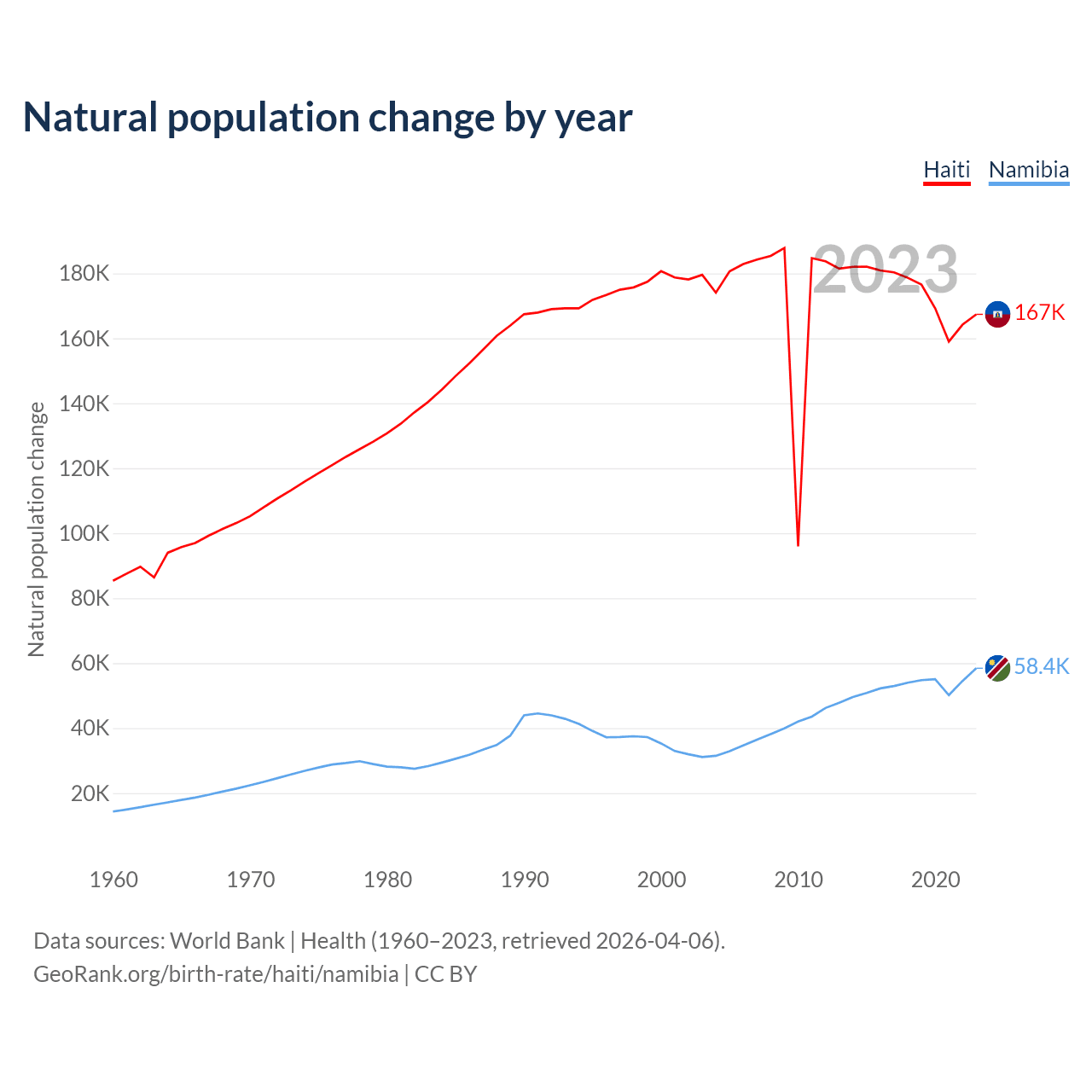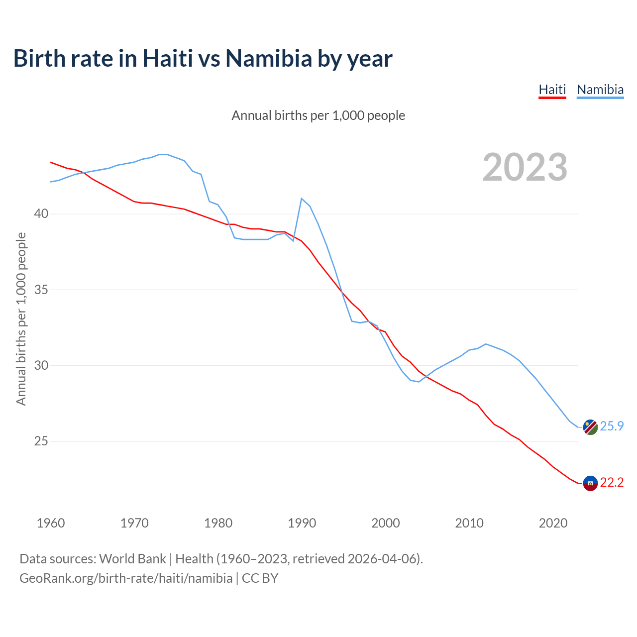 Haiti has an annual birth rate of 22.2 births per 1,000 people, compared to 25.9 for Namibia. The average number of children a woman is expected to have during her lifetime — the fertility rate, is 2.66 in Haiti and 3.21 in Namibia — 20.9% difference.