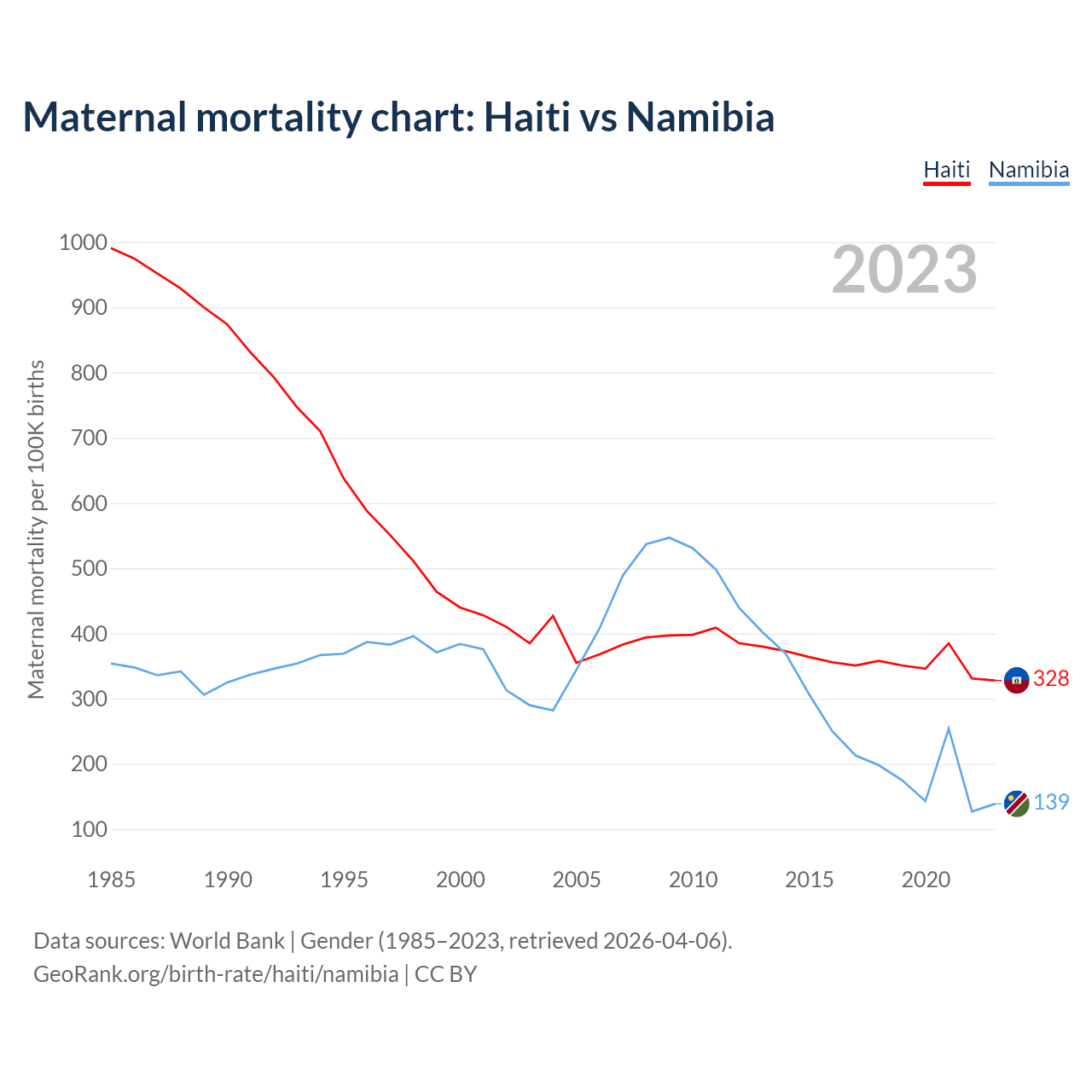 The maternal mortality rate, which is the probability of dying during childbirth or within 42 days of pregnancy termination, is 328 deaths per 100,000 live births in Haiti, compared to 139 deaths in Namibia.