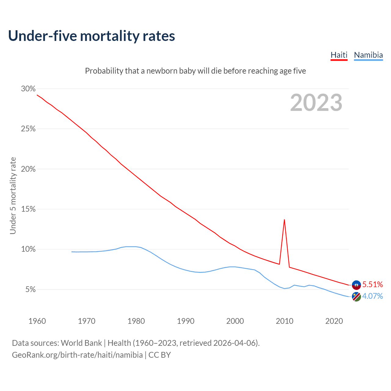 The chance that a newborn baby will die before reaching age five is 5.51% in Haiti and 4.07% in Namibia. Above is a chart with historical data on under-five mortality rates.