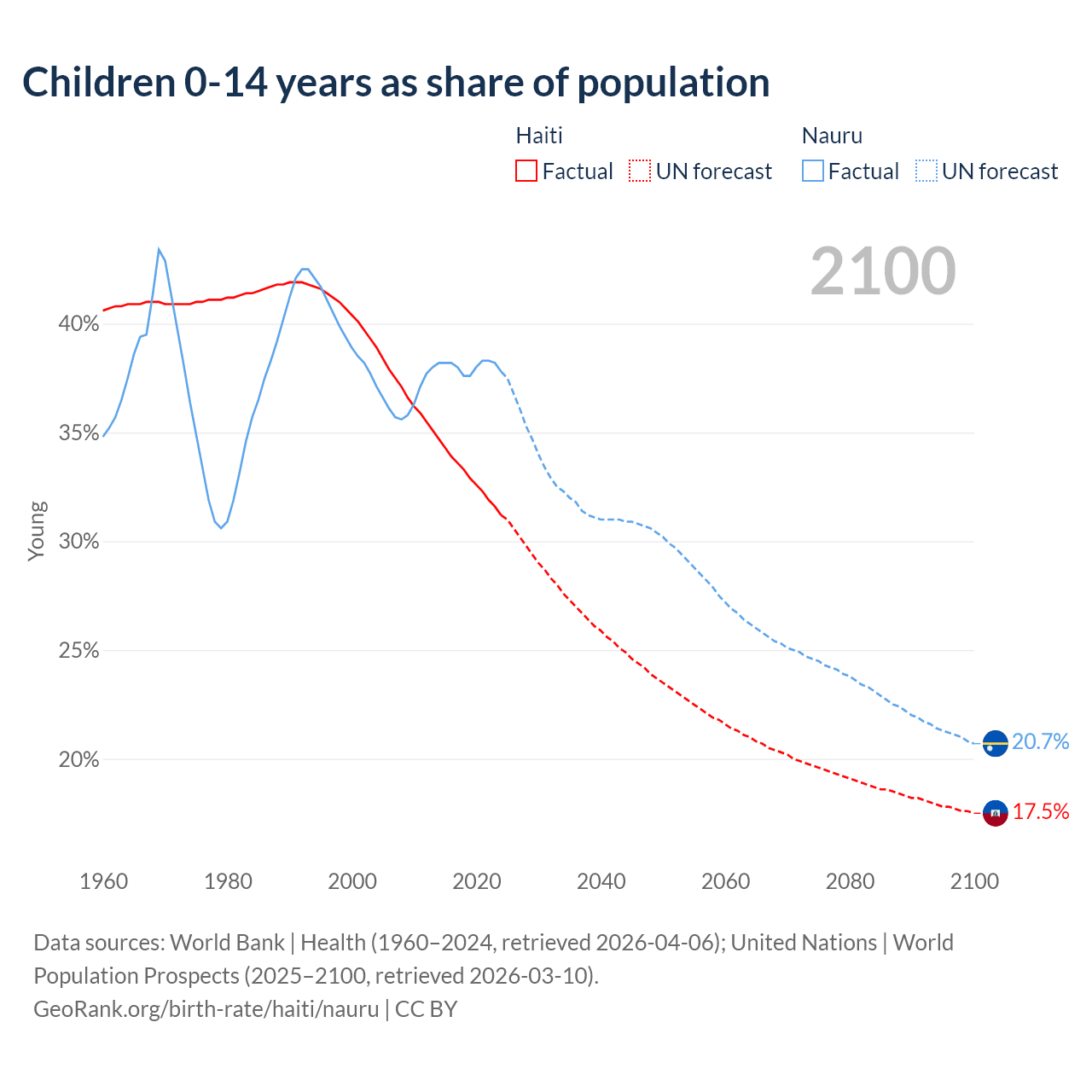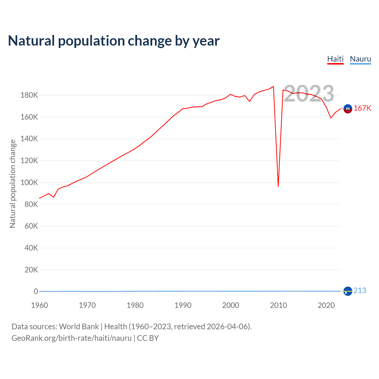 According to the latest available data on birth rates, the fertility rate in Haiti was 2.66 children per woman in 2023, compared to 3.33 in Nauru in 2023. The replacement level is considered to be 2.1 children per woman.