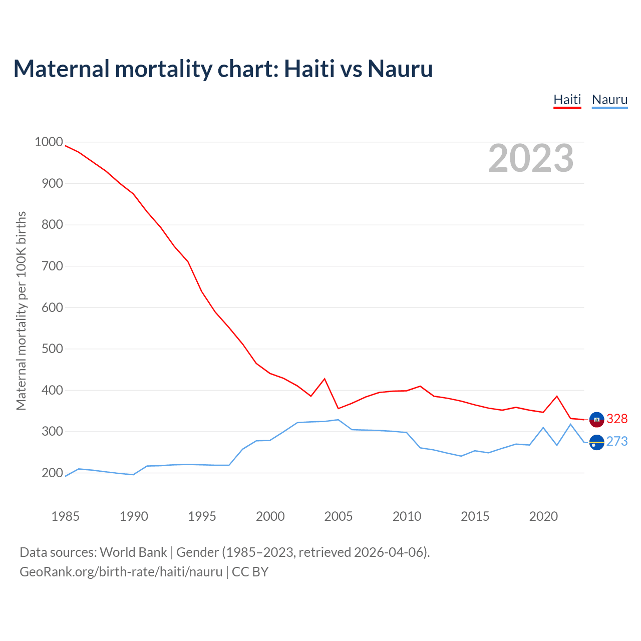 The maternal mortality rate, which is the probability of dying during childbirth or within 42 days of pregnancy termination, is 328 deaths per 100,000 live births in Haiti, compared to 273 deaths in Nauru.