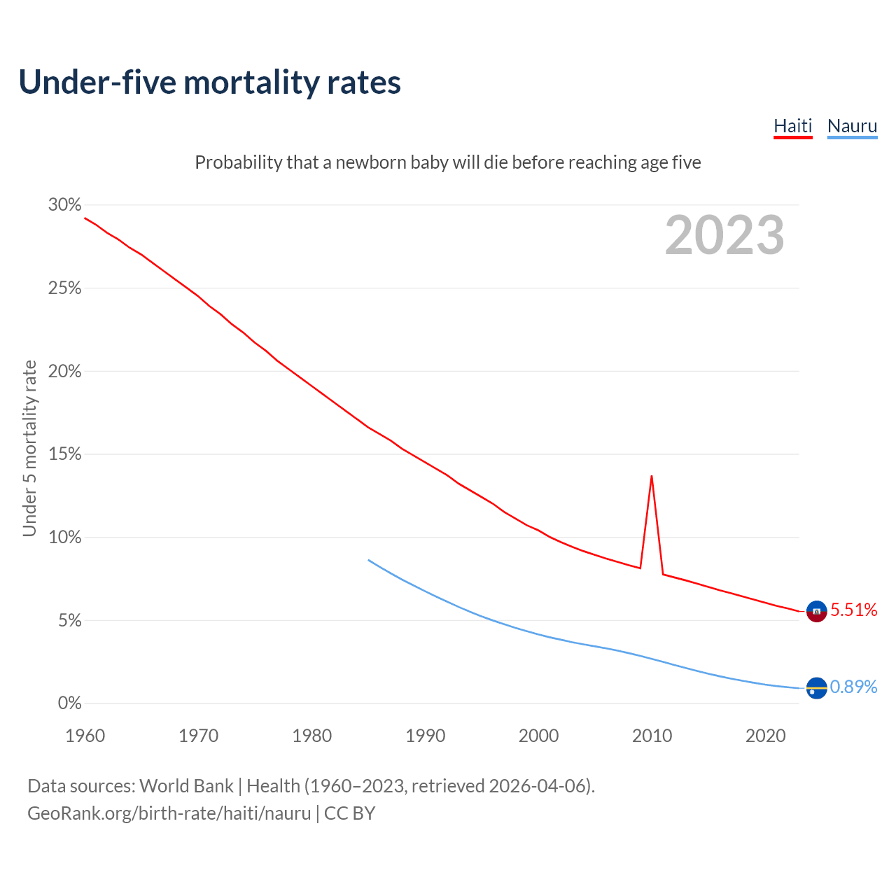 The chance that a newborn baby will die before reaching age five is 5.51% in Haiti and 0.89% in Nauru. Above is a chart with historical data on under-five mortality rates.