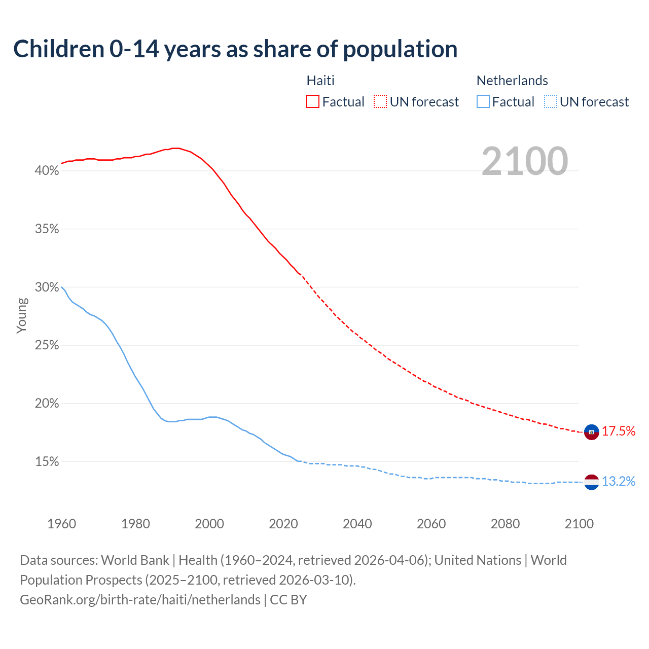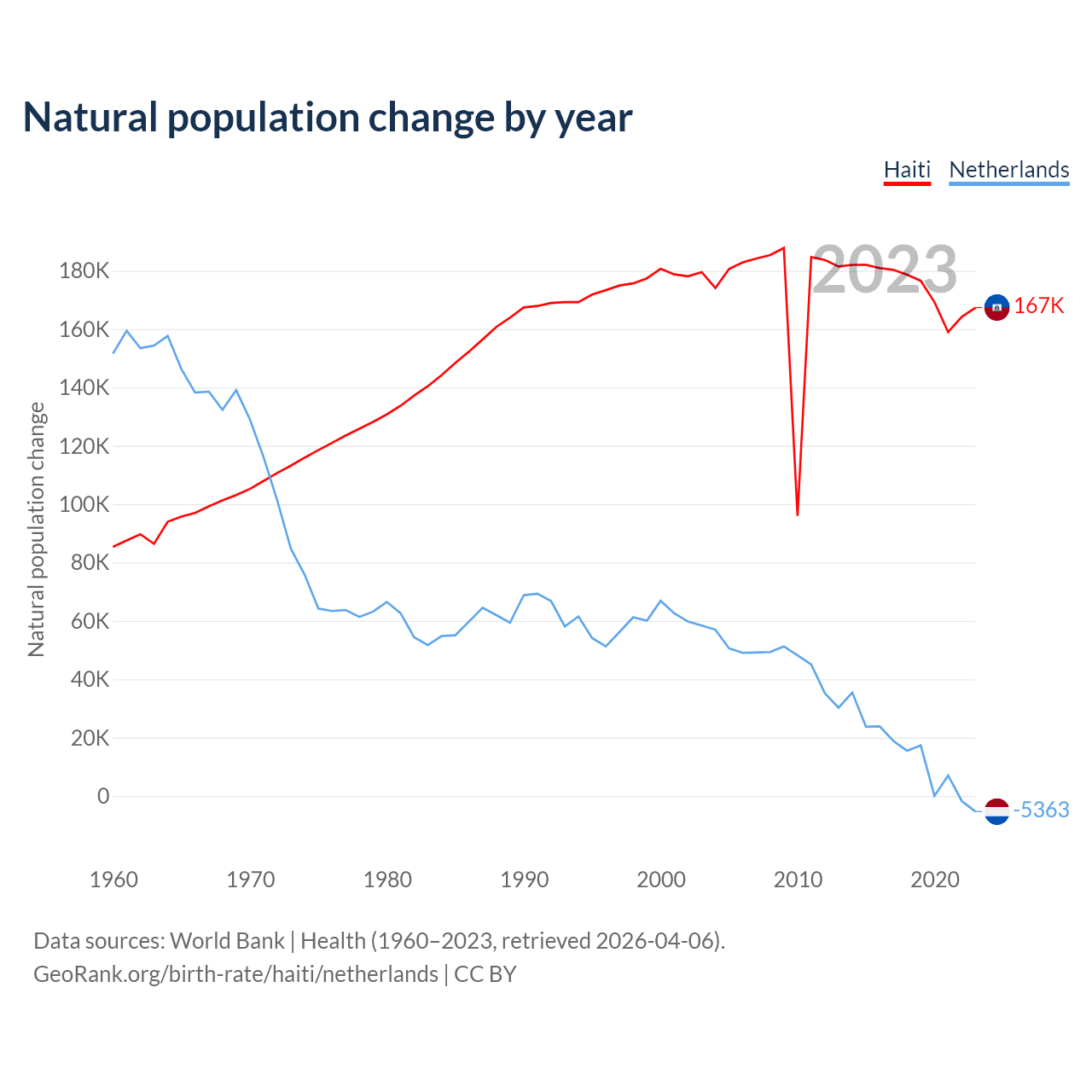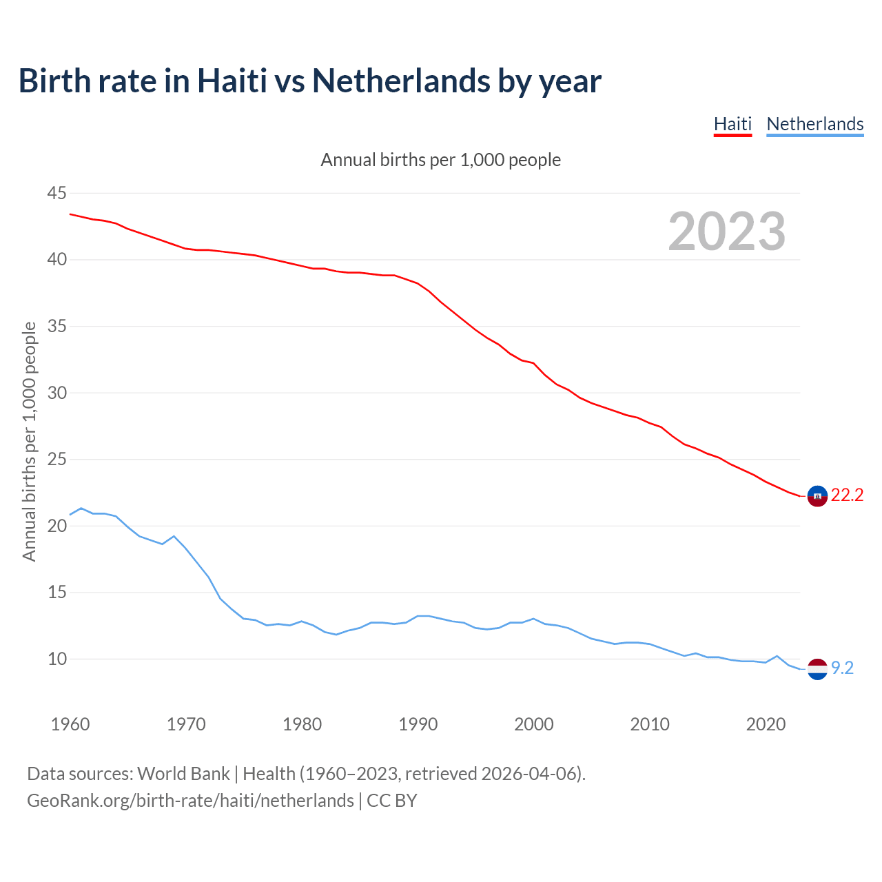According to the latest available data on birth rates, the fertility rate in Haiti was 2.66 children per woman in 2023, compared to 1.43 in the Netherlands in 2023. The replacement level is considered to be 2.1 children per woman.