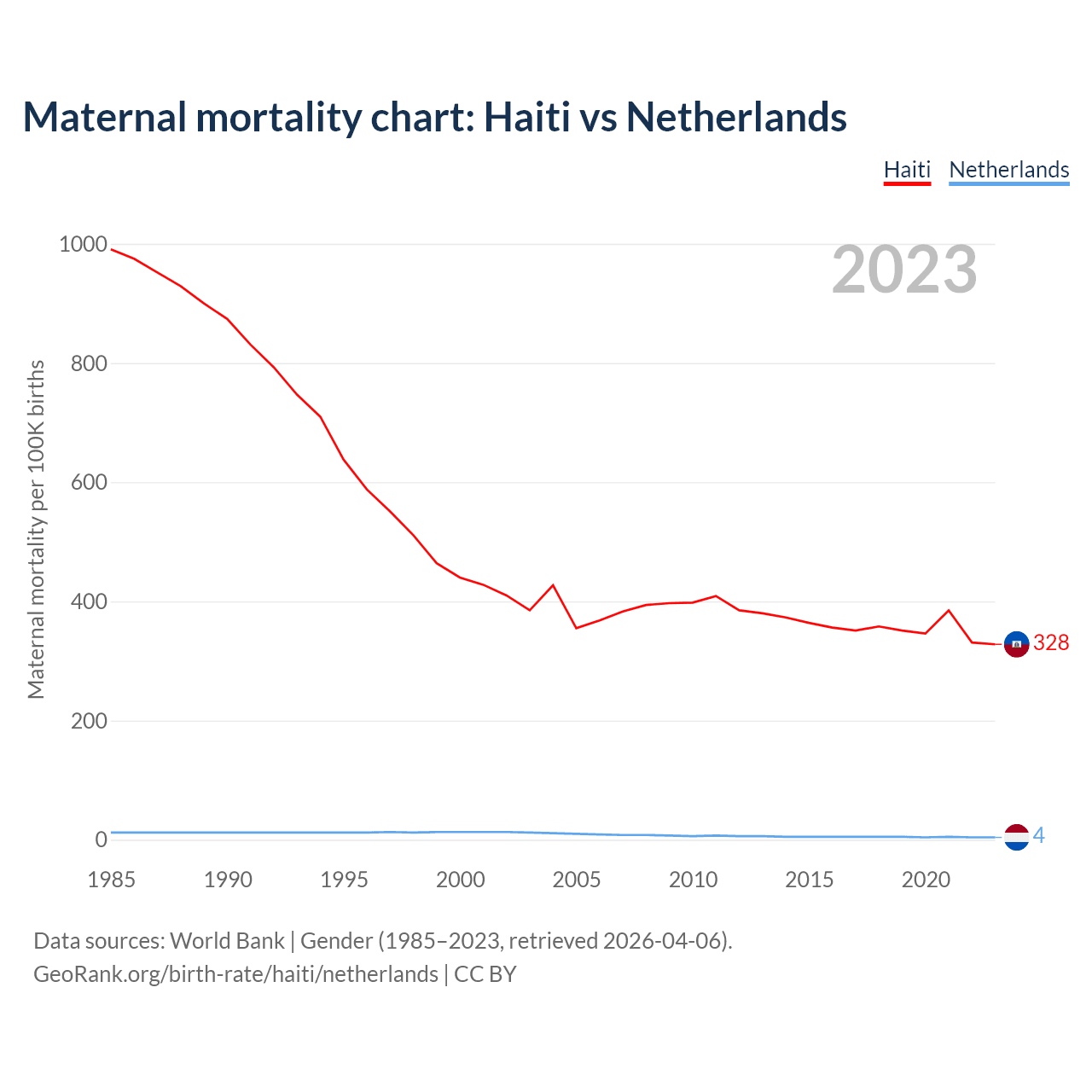 The maternal mortality rate, which is the probability of dying during childbirth or within 42 days of pregnancy termination, is 328 deaths per 100,000 live births in Haiti, compared to 4 deaths in the Netherlands.