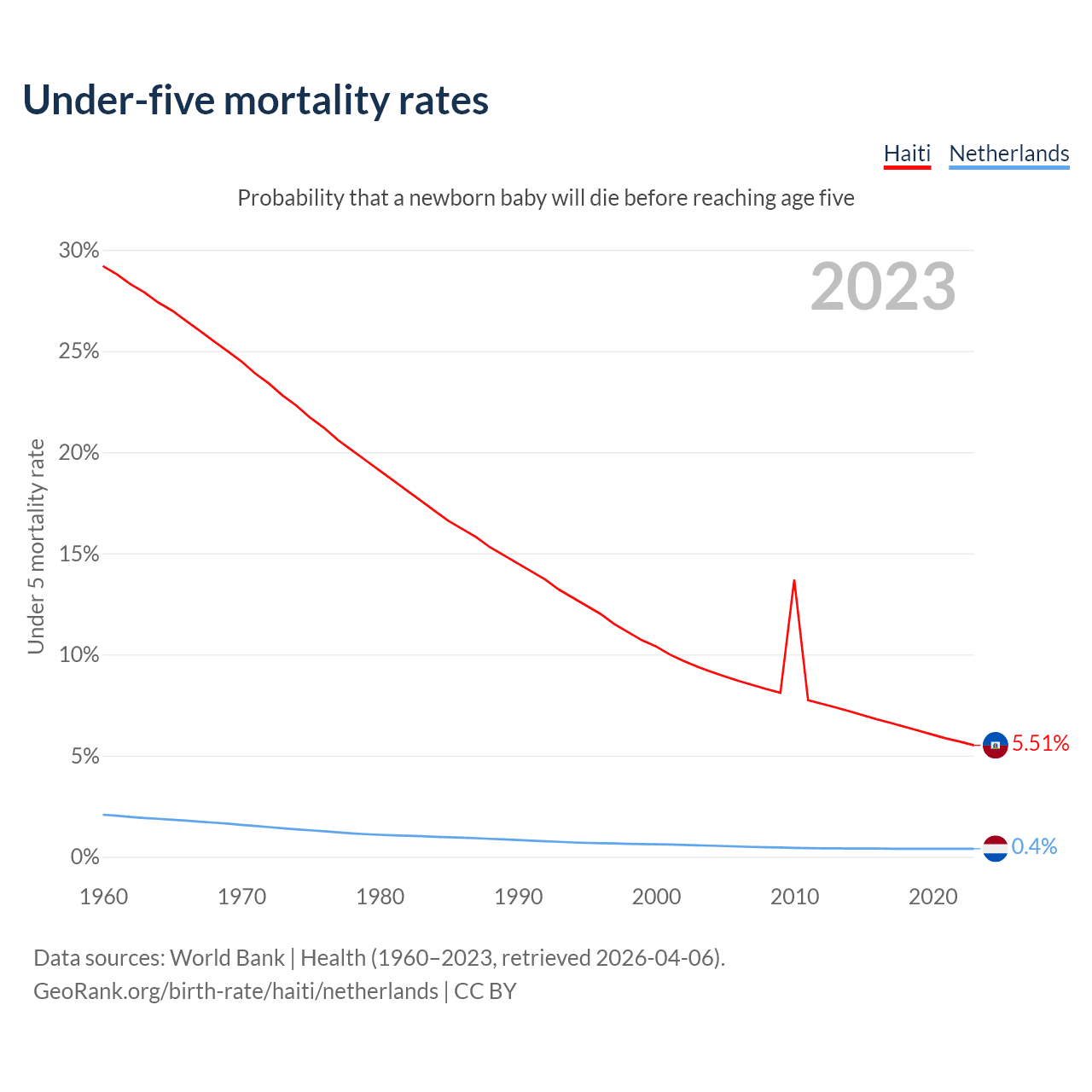 The chance that a newborn baby will die before reaching age five is 5.51% in Haiti and 0.4% in the Netherlands. Above is a chart with historical data on under-five mortality rates.