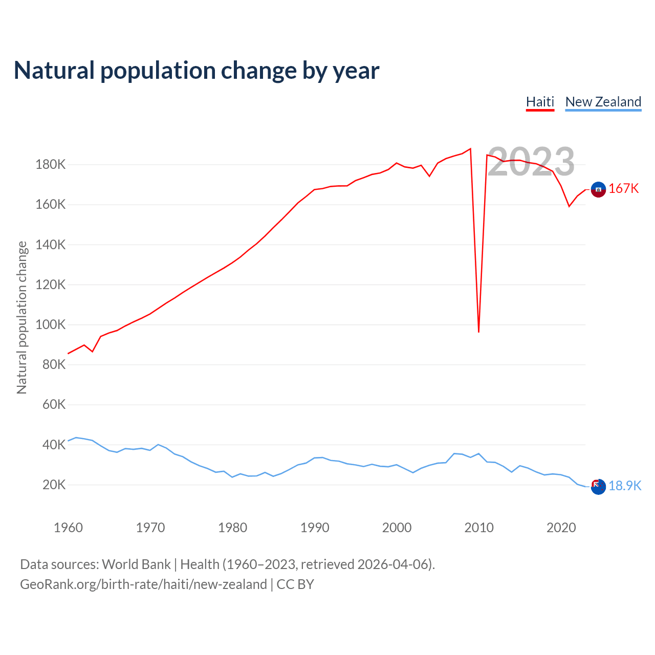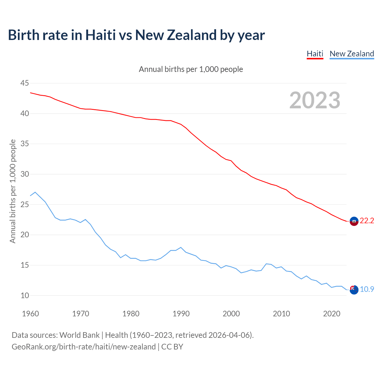 Haiti has an annual birth rate of 22.2 births per 1,000 people, compared to 10.9 for New Zealand. The average number of children a woman is expected to have during her lifetime — the fertility rate, is 2.66 in Haiti and 1.56 in New Zealand — 41.3% difference.