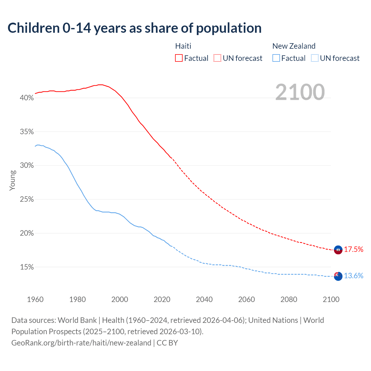 According to the latest available data on birth rates, the fertility rate in Haiti was 2.66 children per woman in 2023, compared to 1.56 in New Zealand in 2023. The replacement level is considered to be 2.1 children per woman.