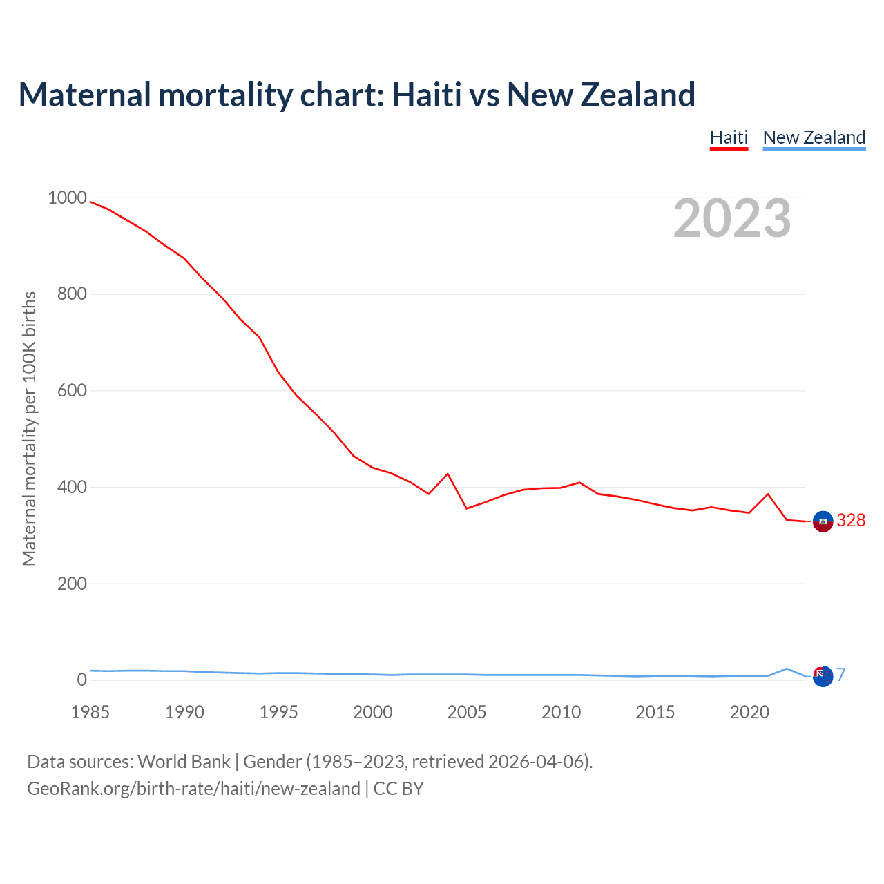 The maternal mortality rate, which is the probability of dying during childbirth or within 42 days of pregnancy termination, is 328 deaths per 100,000 live births in Haiti, compared to 7 deaths in New Zealand.