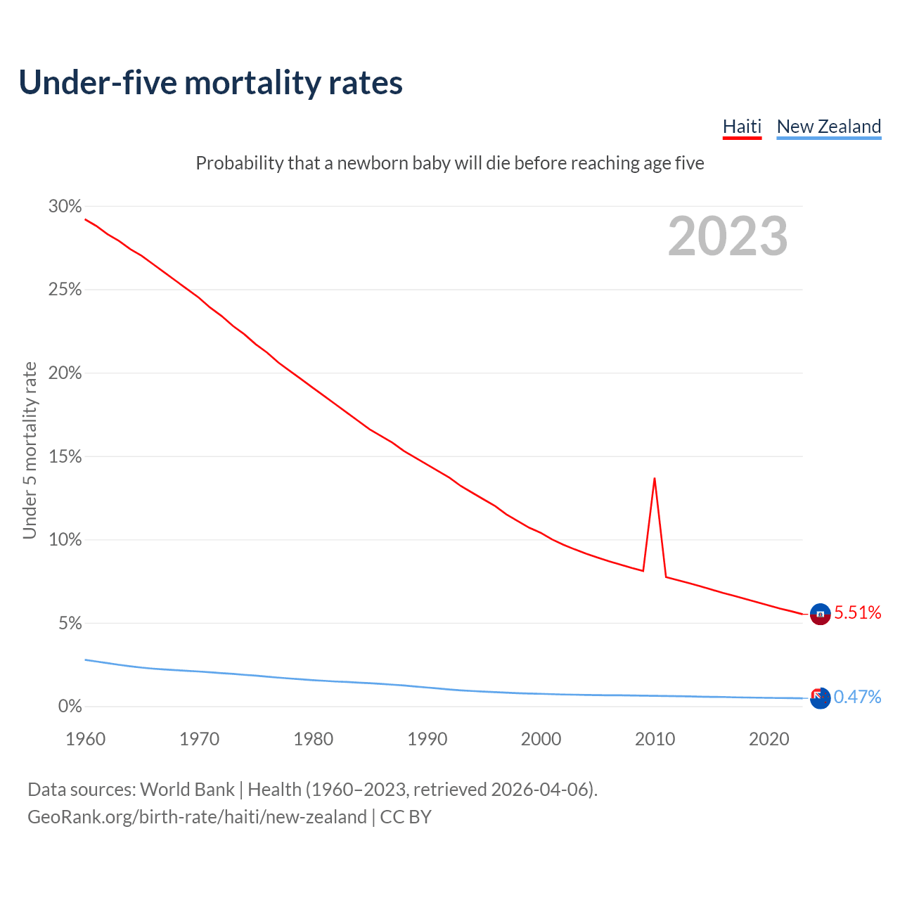 The chance that a newborn baby will die before reaching age five is 5.51% in Haiti and 0.47% in New Zealand. Above is a chart with historical data on under-five mortality rates.