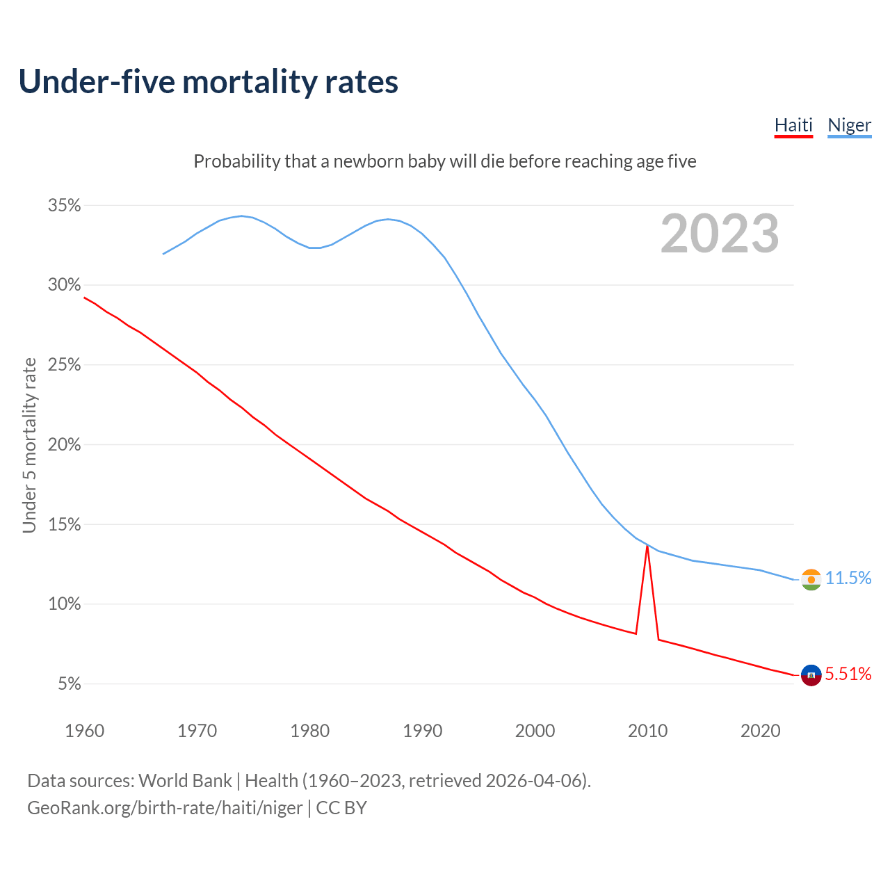 The chance that a newborn baby will die before reaching age five is 5.51% in Haiti and 11.5% in Niger. Above is a chart with historical data on under-five mortality rates.