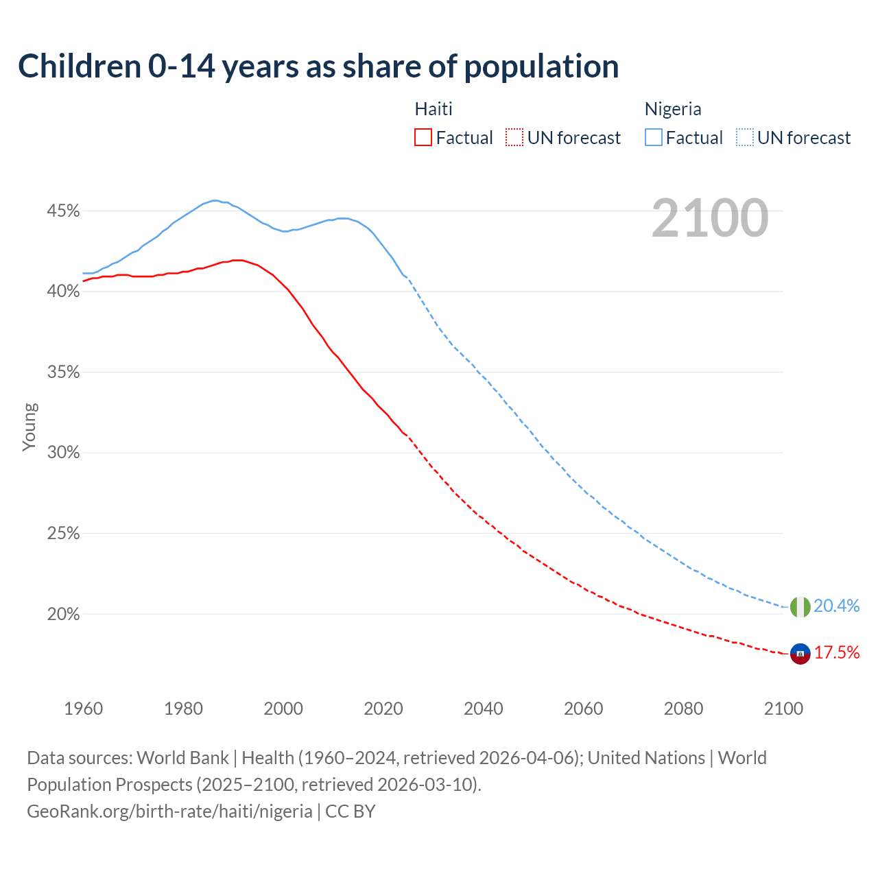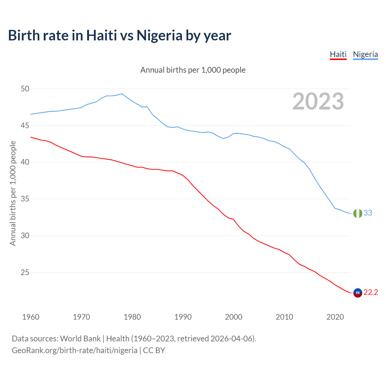 According to the latest available data on birth rates, the fertility rate in Haiti was 2.66 children per woman in 2023, compared to 4.48 in Nigeria in 2023. The replacement level is considered to be 2.1 children per woman.