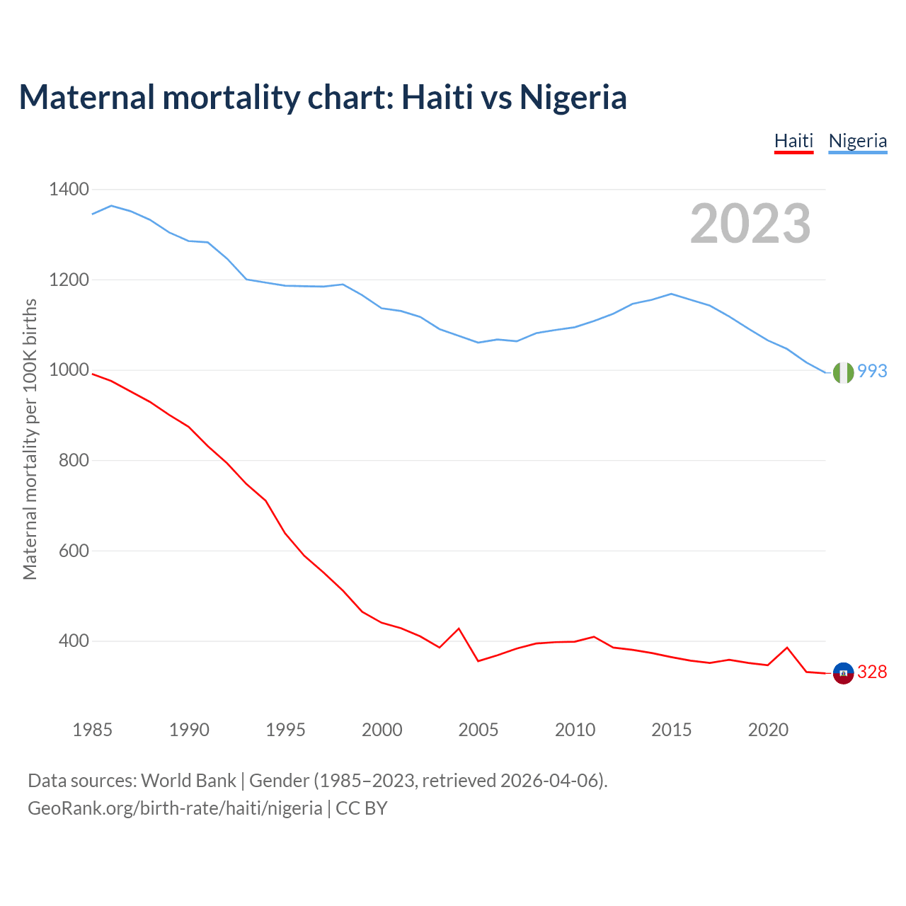 The maternal mortality rate, which is the probability of dying during childbirth or within 42 days of pregnancy termination, is 328 deaths per 100,000 live births in Haiti, compared to 993 deaths in Nigeria.