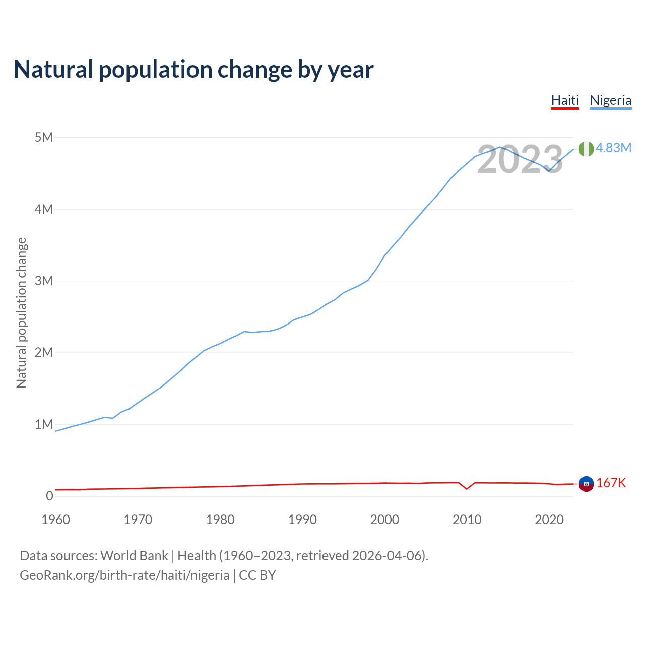 Haiti has an annual birth rate of 22.2 births per 1,000 people, compared to 33 for Nigeria. The average number of children a woman is expected to have during her lifetime — the fertility rate, is 2.66 in Haiti and 4.48 in Nigeria — 68.8% difference.
