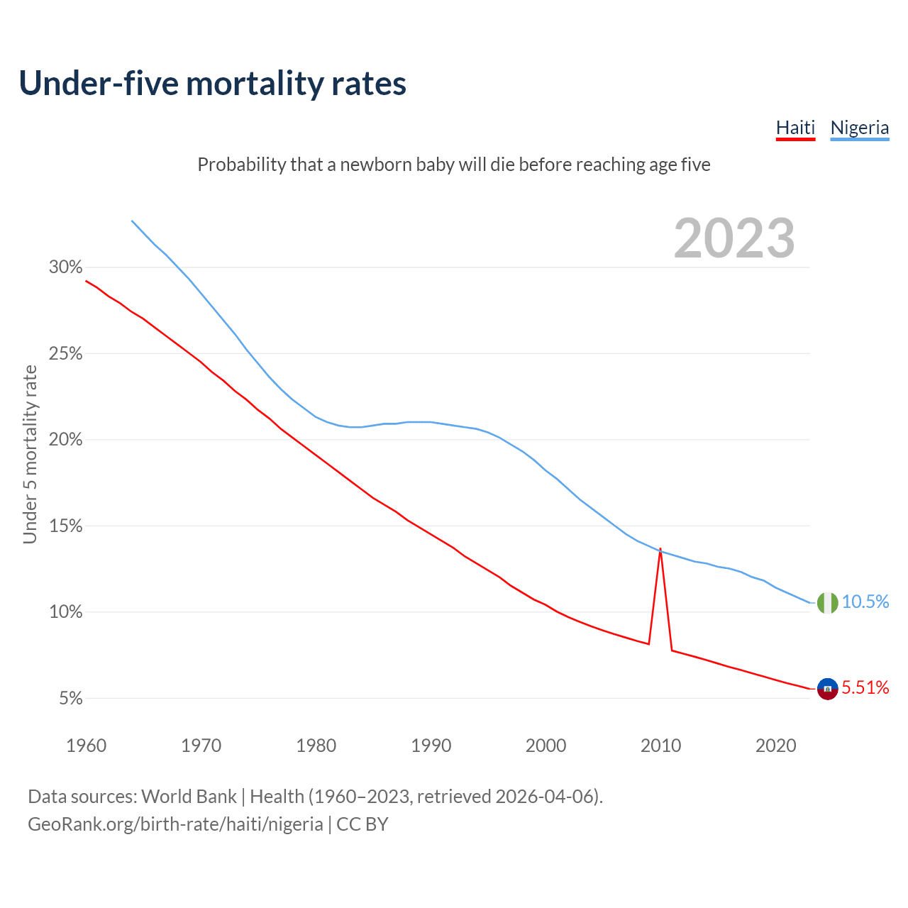 The chance that a newborn baby will die before reaching age five is 5.51% in Haiti and 10.5% in Nigeria. Above is a chart with historical data on under-five mortality rates.