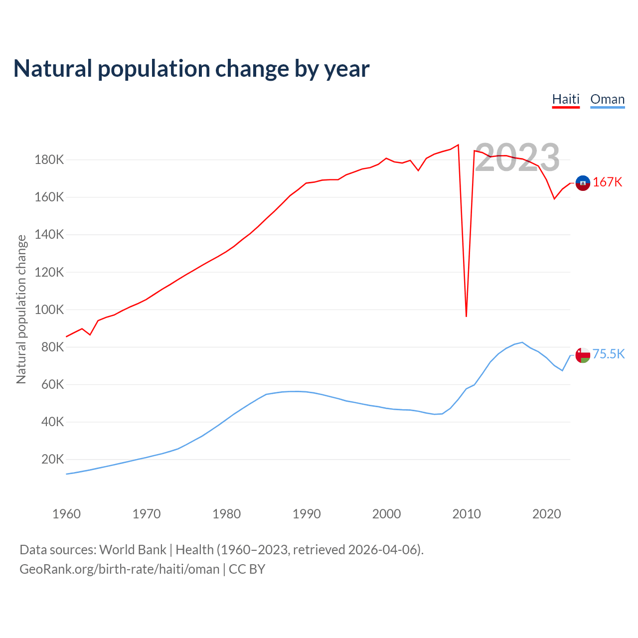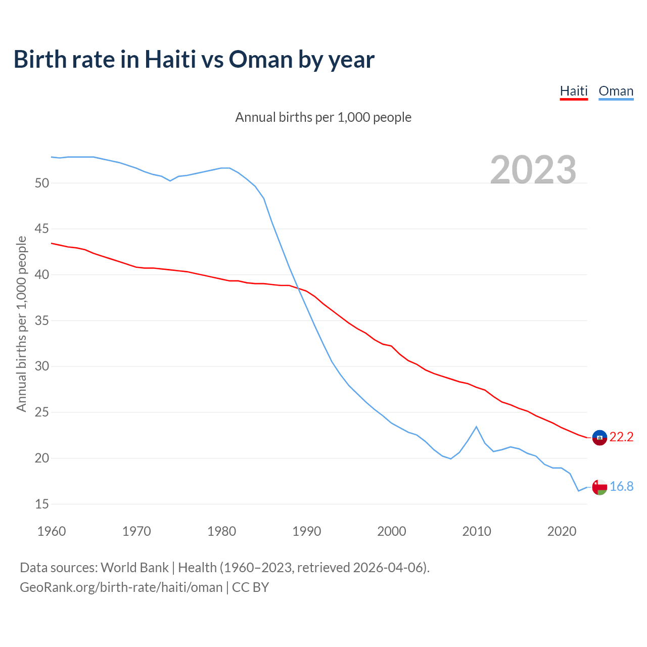 Haiti has an annual birth rate of 22.2 births per 1,000 people, compared to 16.8 for Oman. The average number of children a woman is expected to have during her lifetime — the fertility rate, is 2.66 in Haiti and 2.53 in Oman — 4.93% difference.