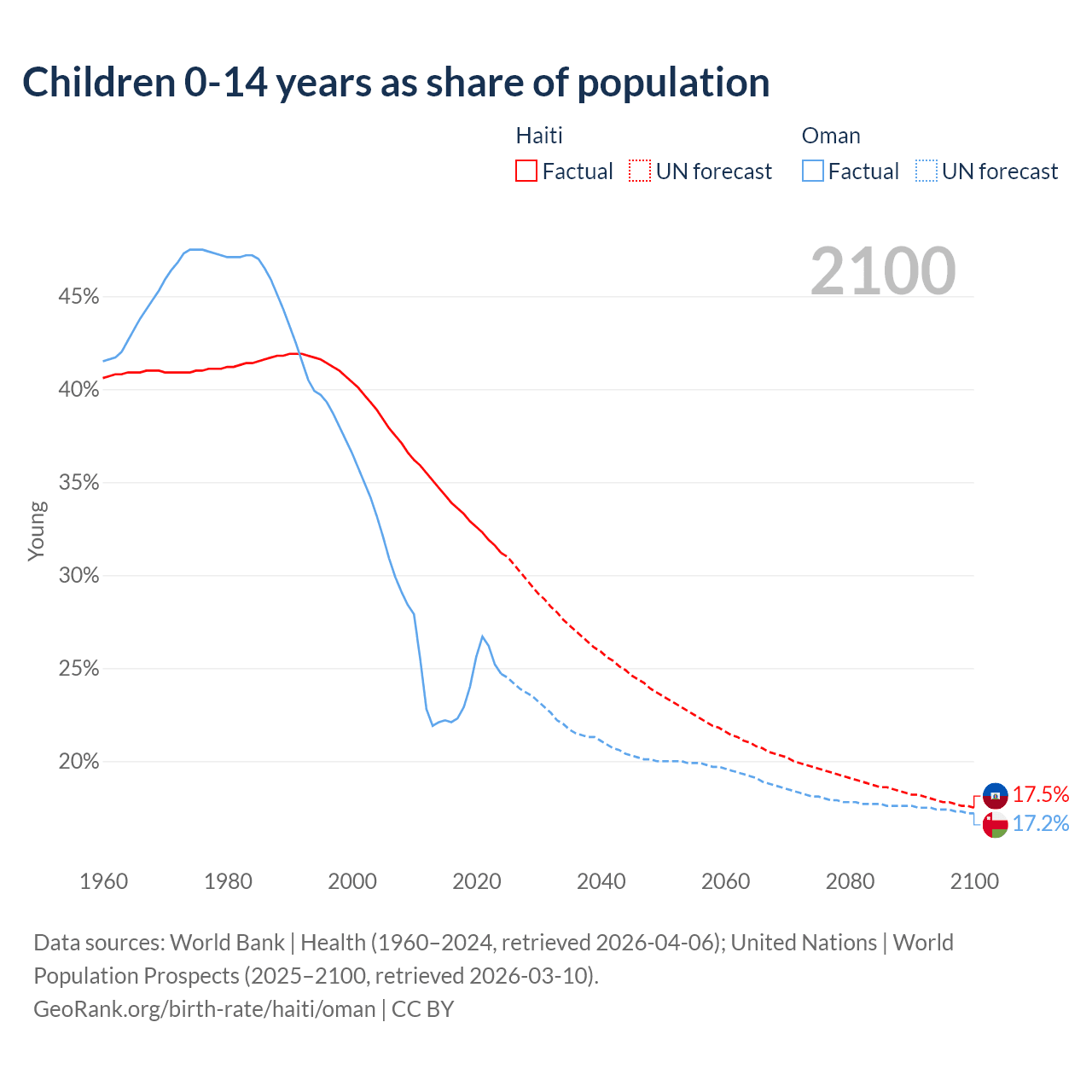 According to the latest available data on birth rates, the fertility rate in Haiti was 2.66 children per woman in 2023, compared to 2.53 in Oman in 2023. The replacement level is considered to be 2.1 children per woman.