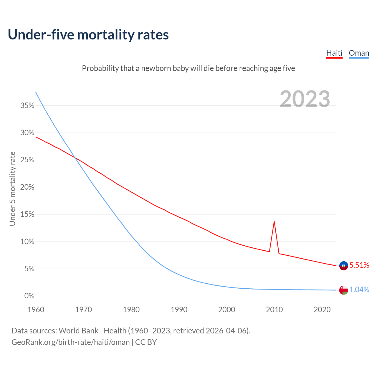 The chance that a newborn baby will die before reaching age five is 5.51% in Haiti and 1.04% in Oman. Above is a chart with historical data on under-five mortality rates.