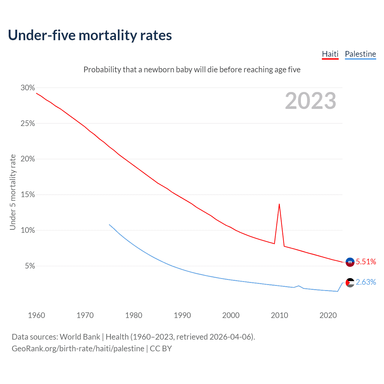 The chance that a newborn baby will die before reaching age five is 5.51% in Haiti and 2.63% in Palestine. Above is a chart with historical data on under-five mortality rates.