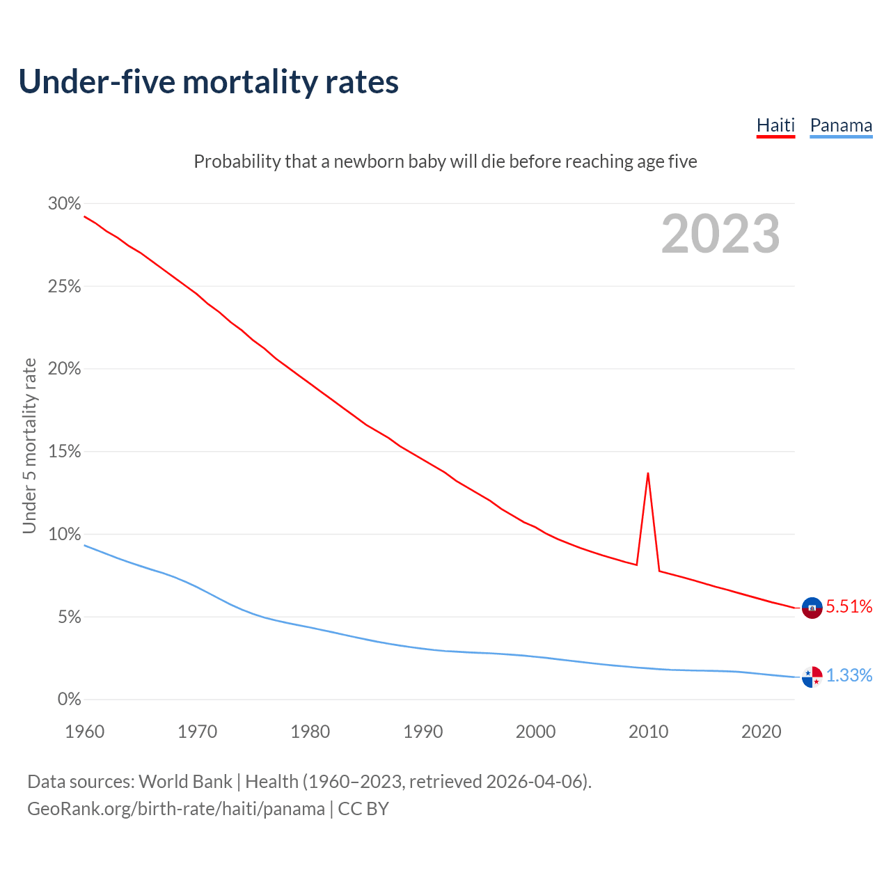 The chance that a newborn baby will die before reaching age five is 5.51% in Haiti and 1.33% in Panama. Above is a chart with historical data on under-five mortality rates.